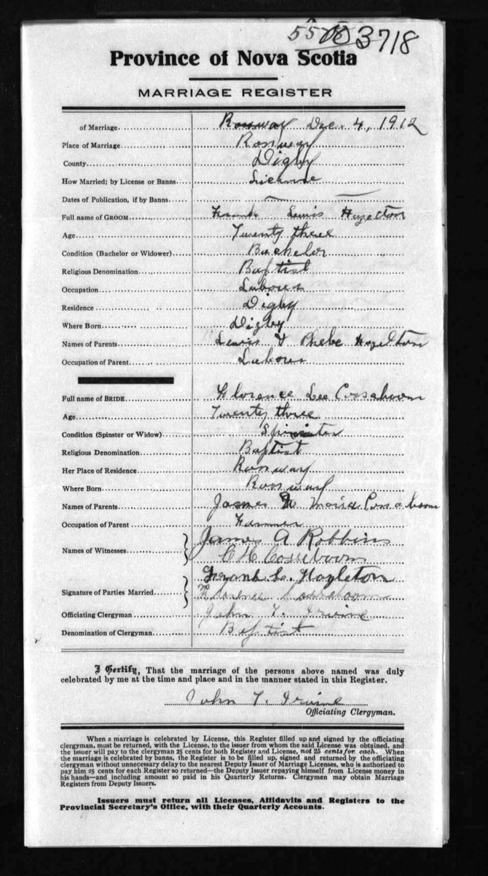 Registration: Year: 1912 number: 3718