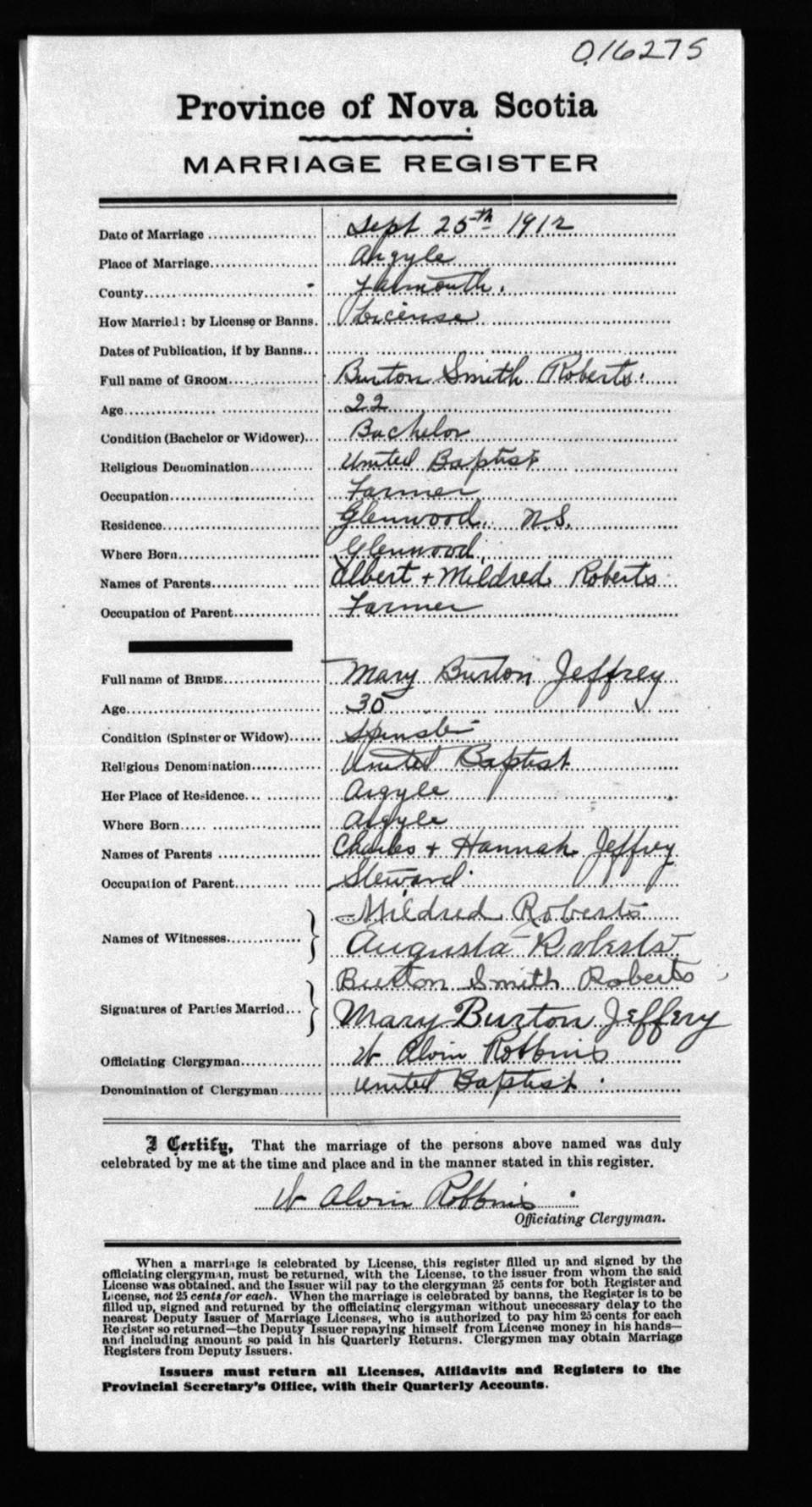 Registration: Year: 1912 number: 16275