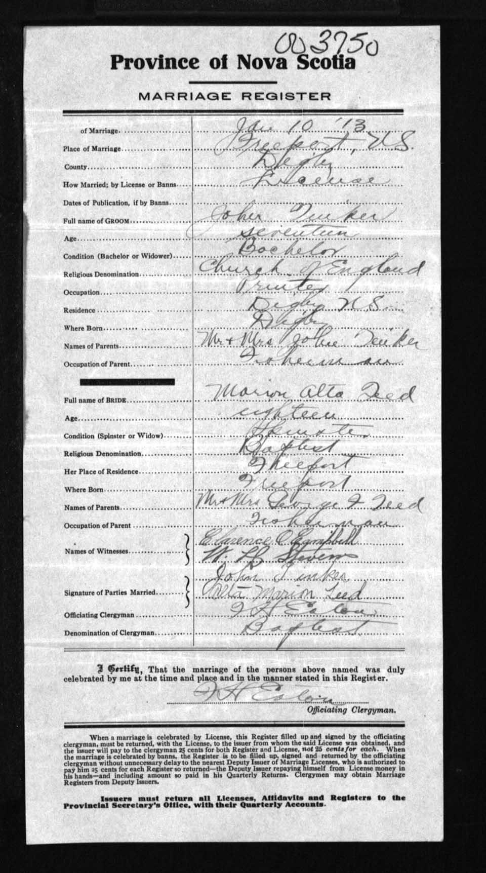 Registration: Year: 1913 number: 3750