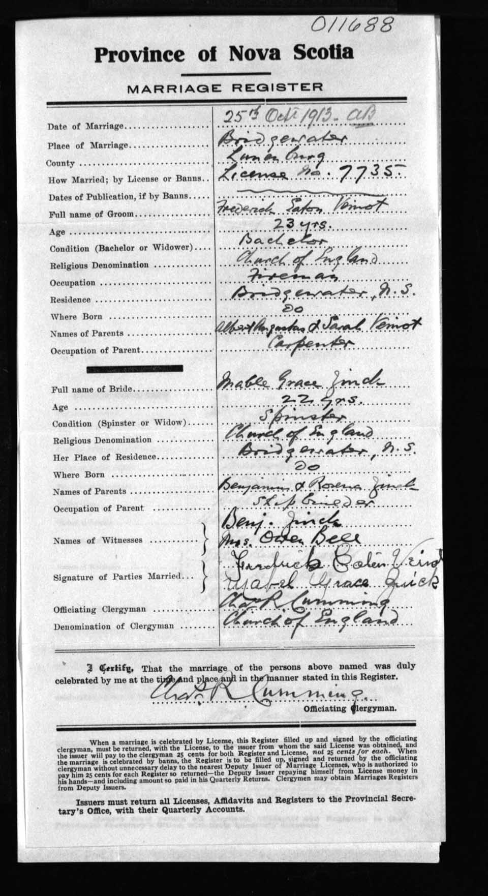 Registration: Year: 1913 number: 11688