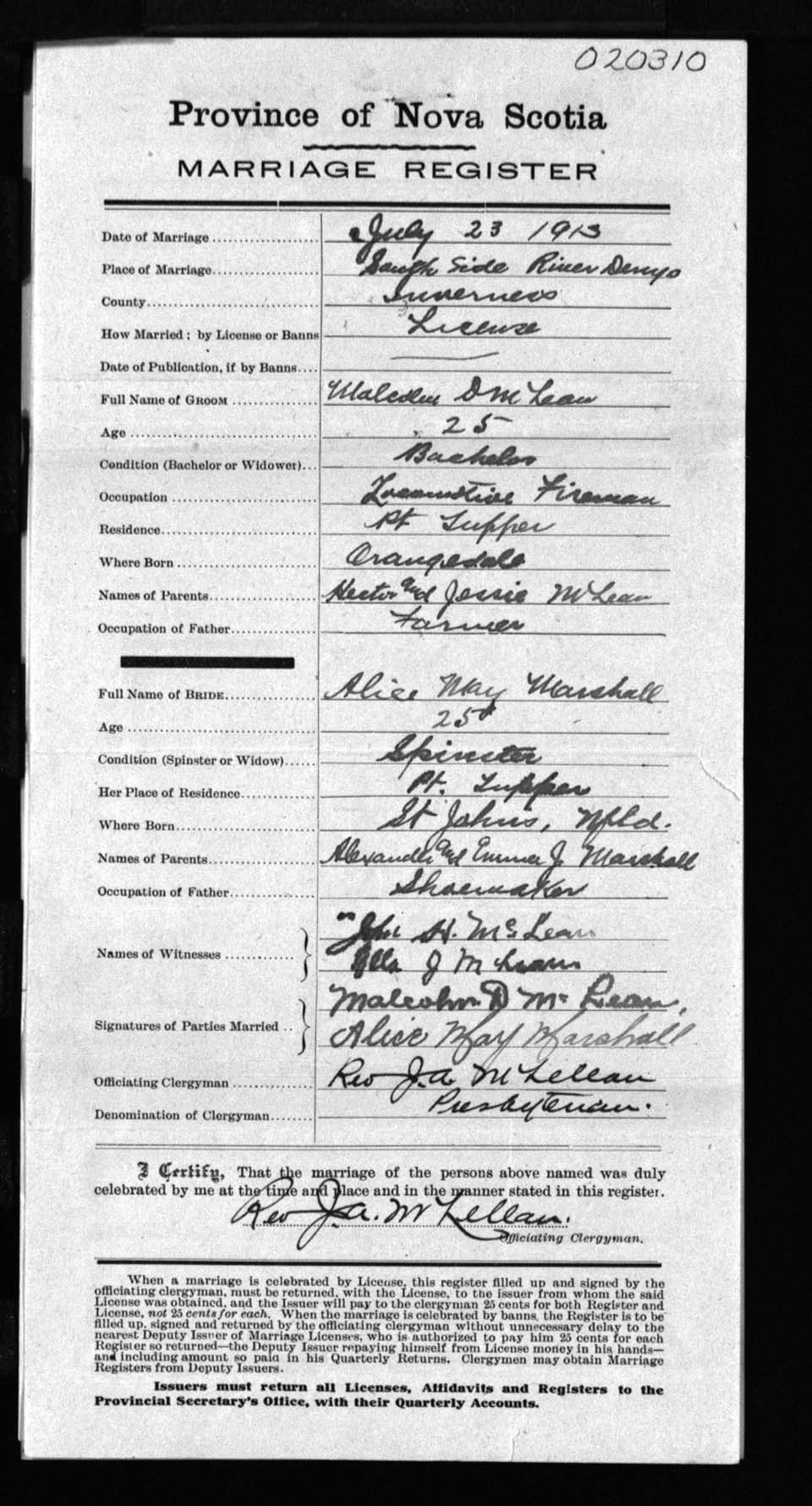 Registration: Year: 1913 number: 20310