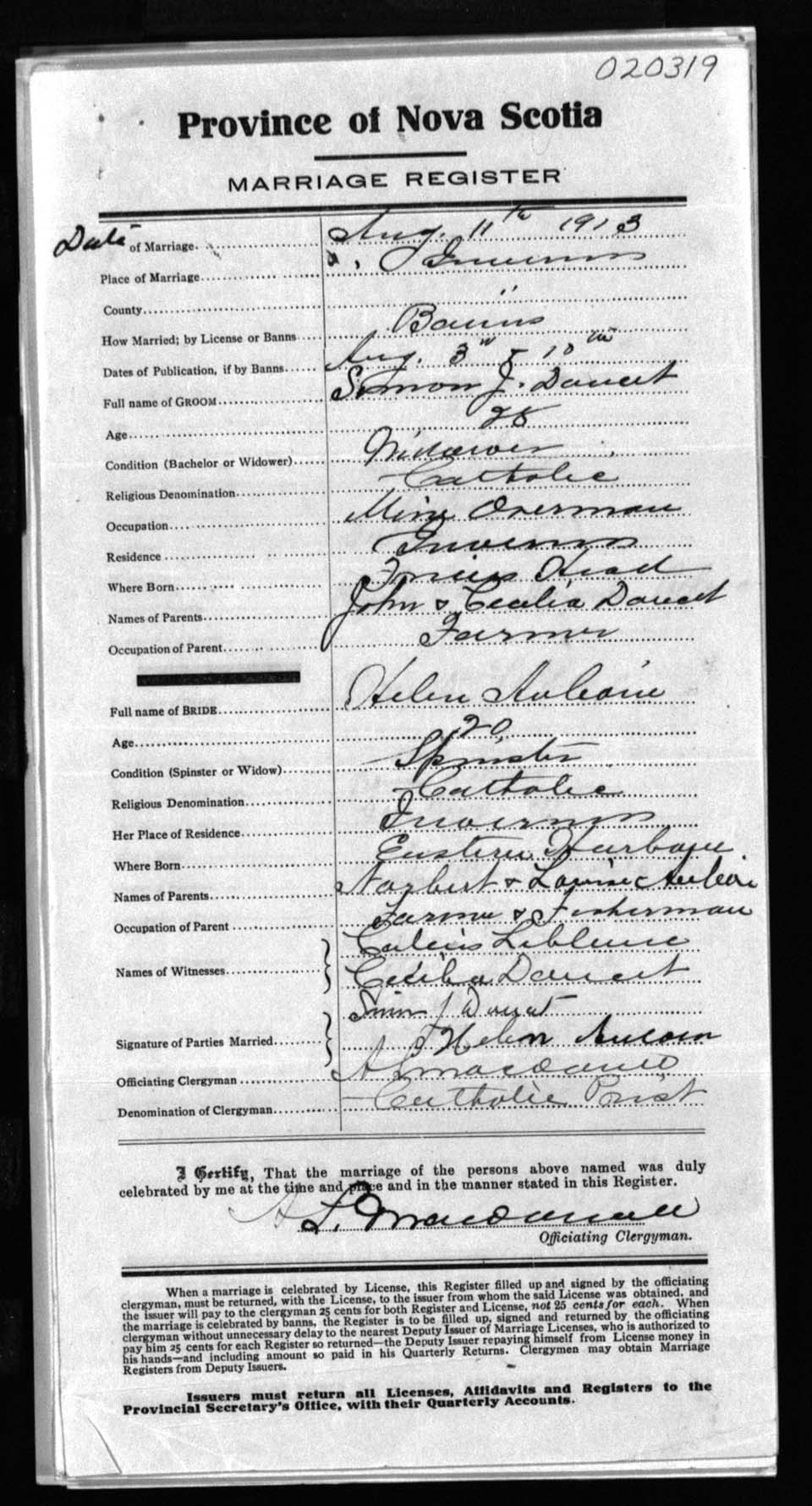 Registration: Year: 1913 number: 20319