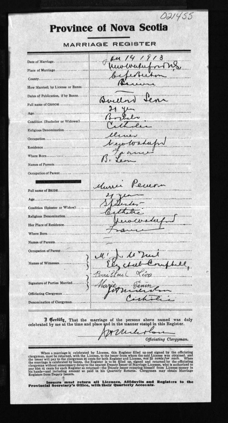 Registration: Year: 1913 number: 21455