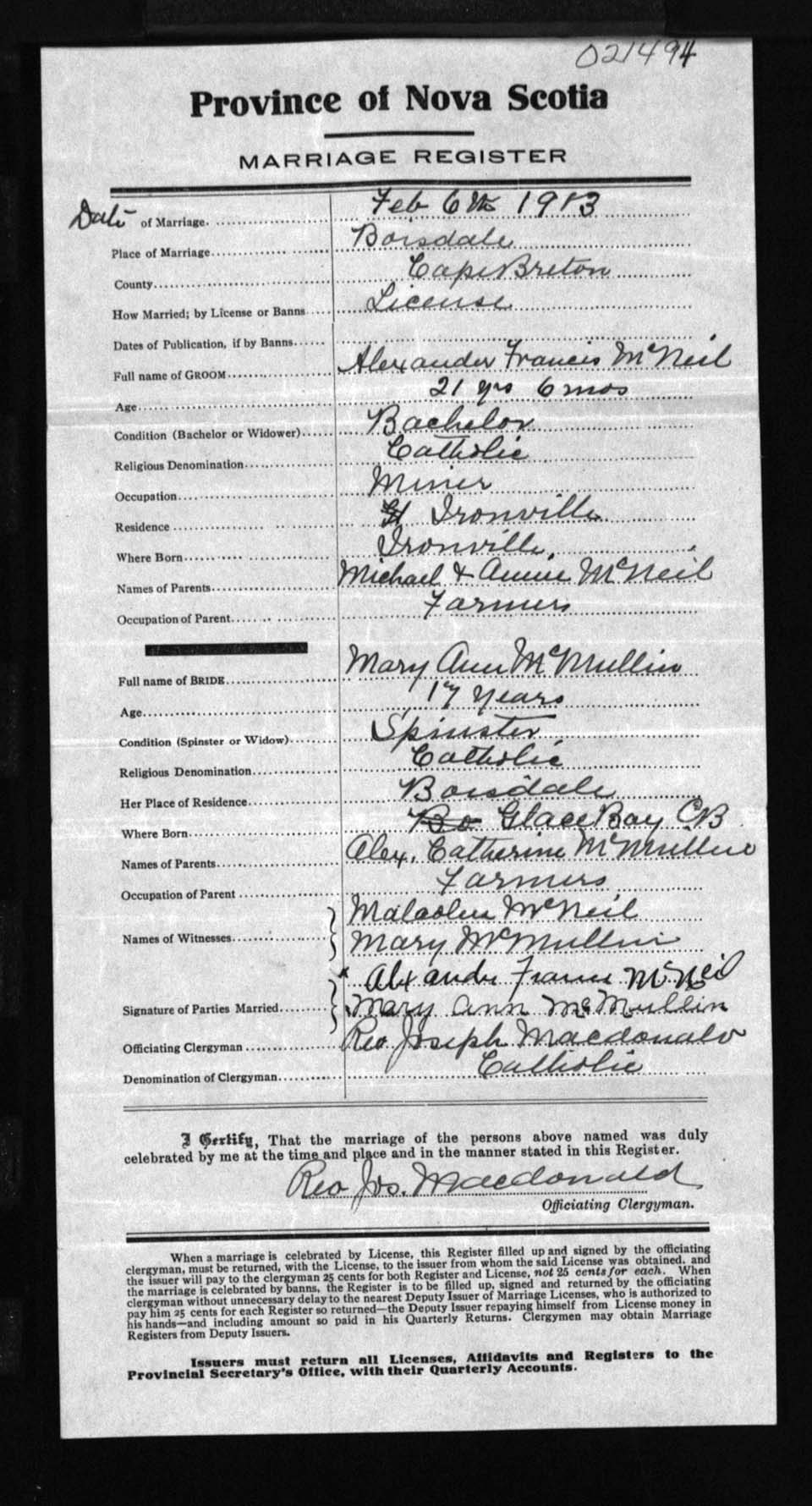 Registration: Year: 1913 number: 21494