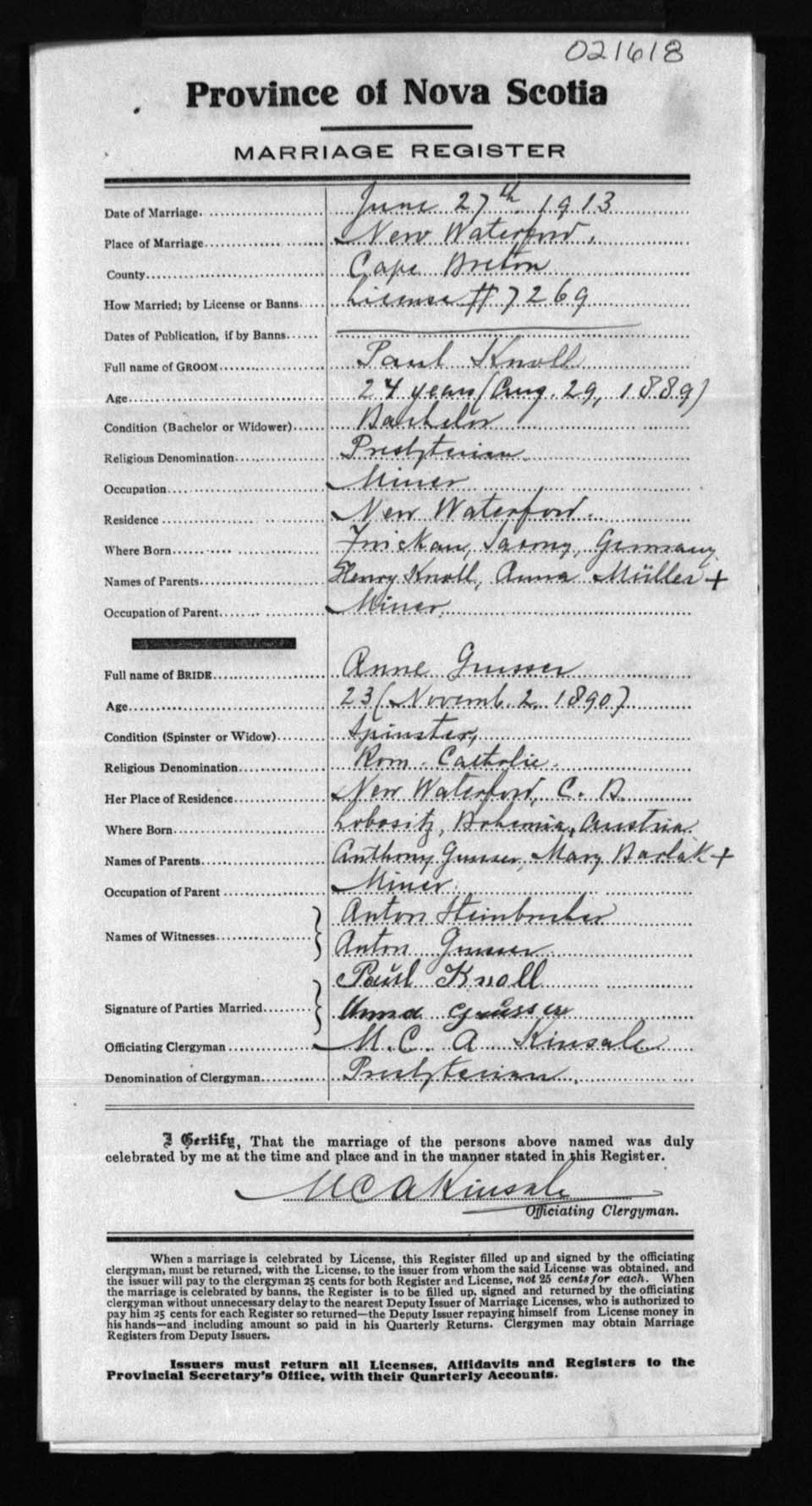 Registration: Year: 1913 number: 21618