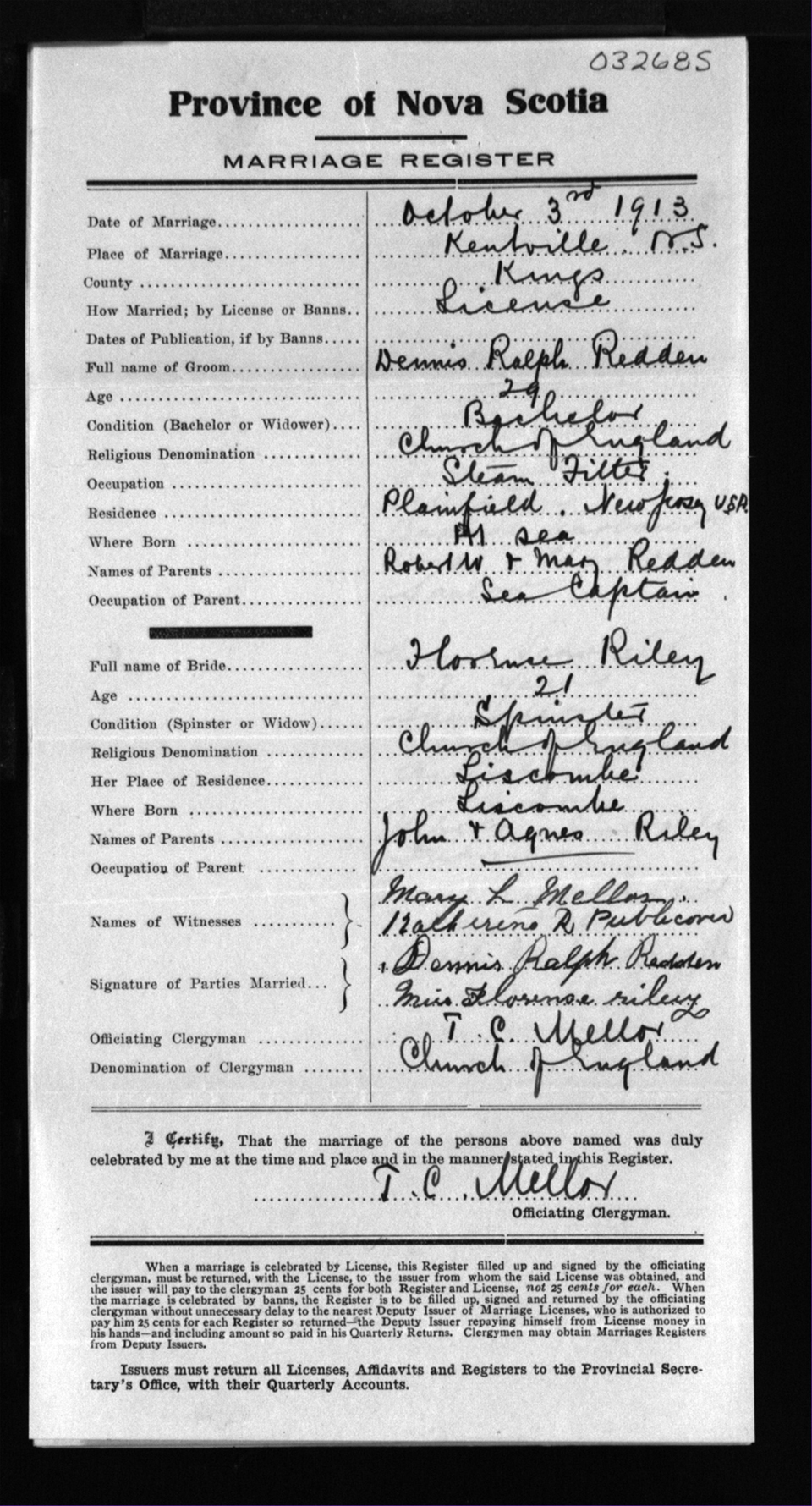 Registration: Year: 1913 number: 32685