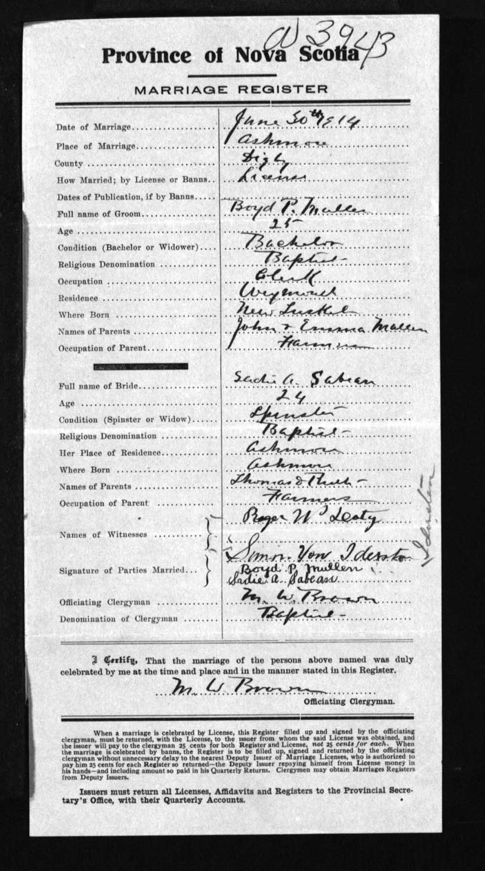 Registration: Year: 1914 number: 3943