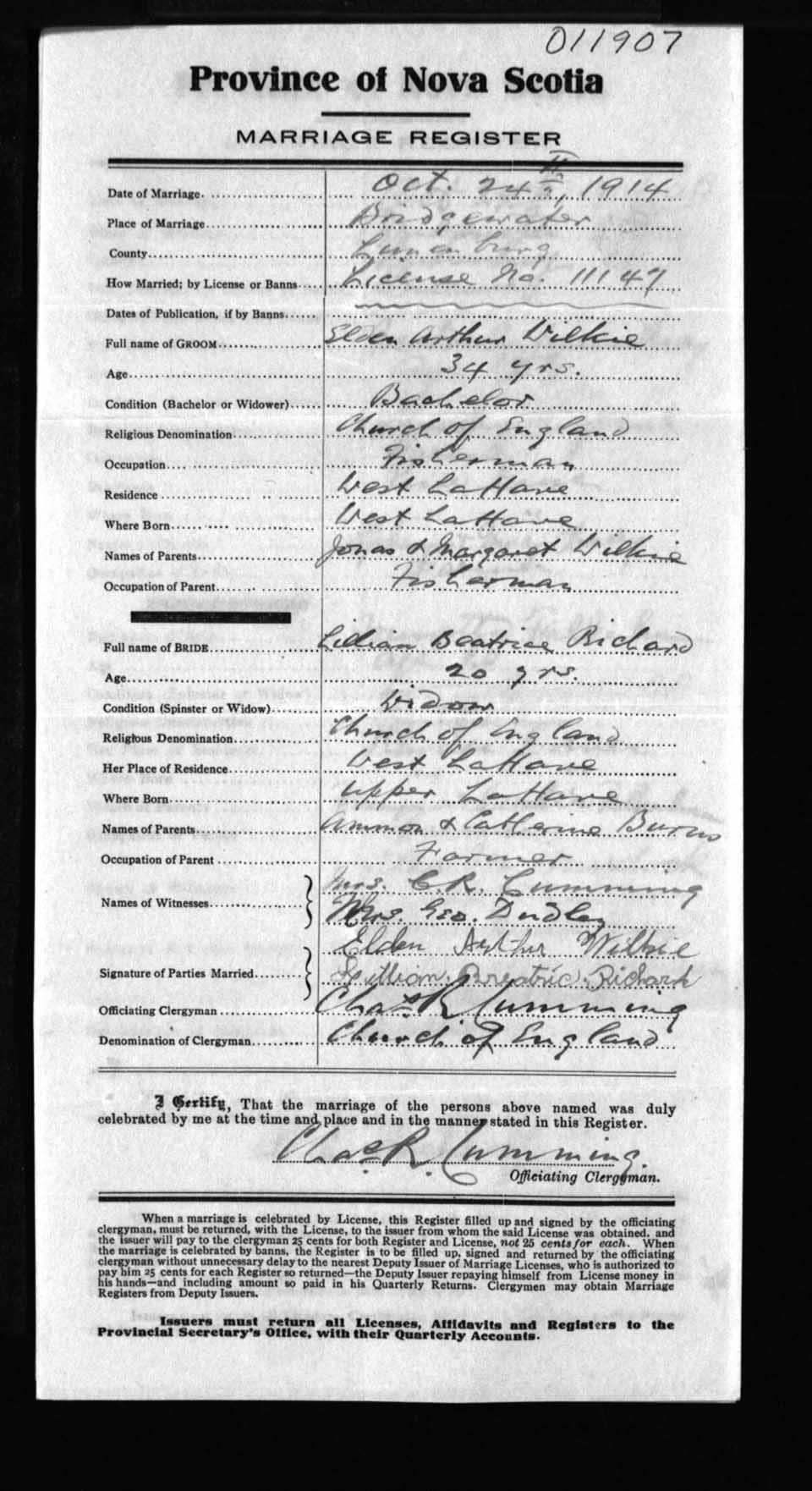 Registration: Year: 1914 number: 11907