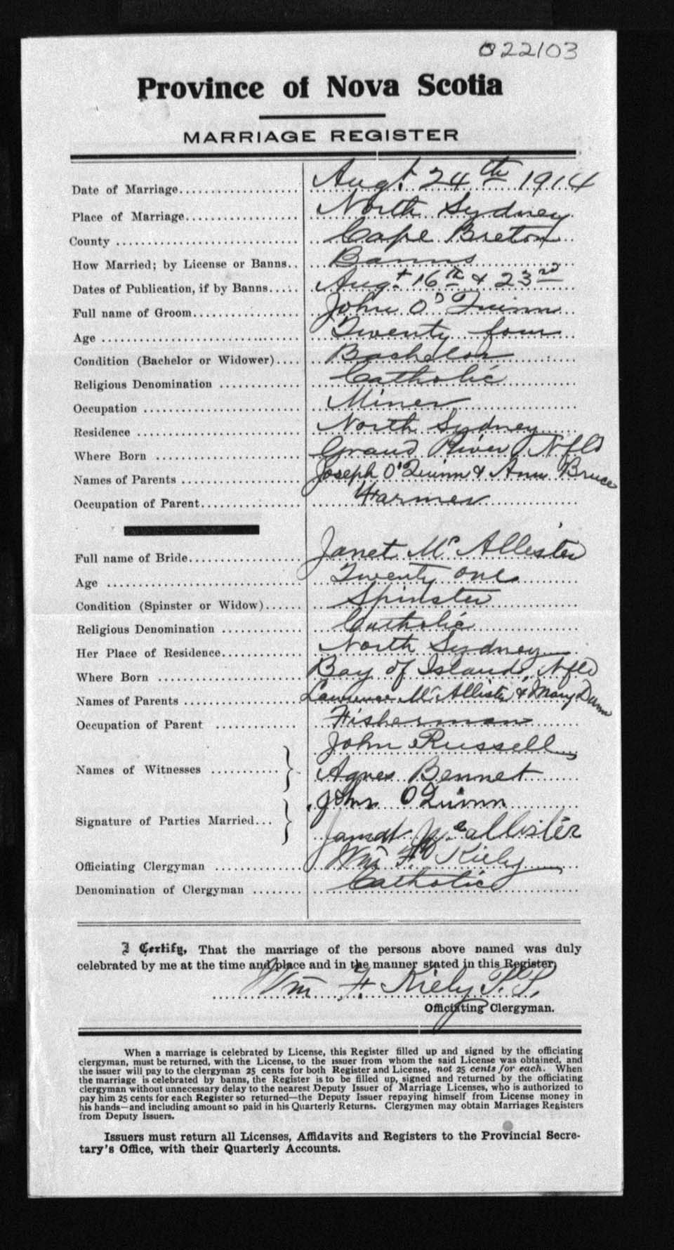 Registration: Year: 1914 number: 22103