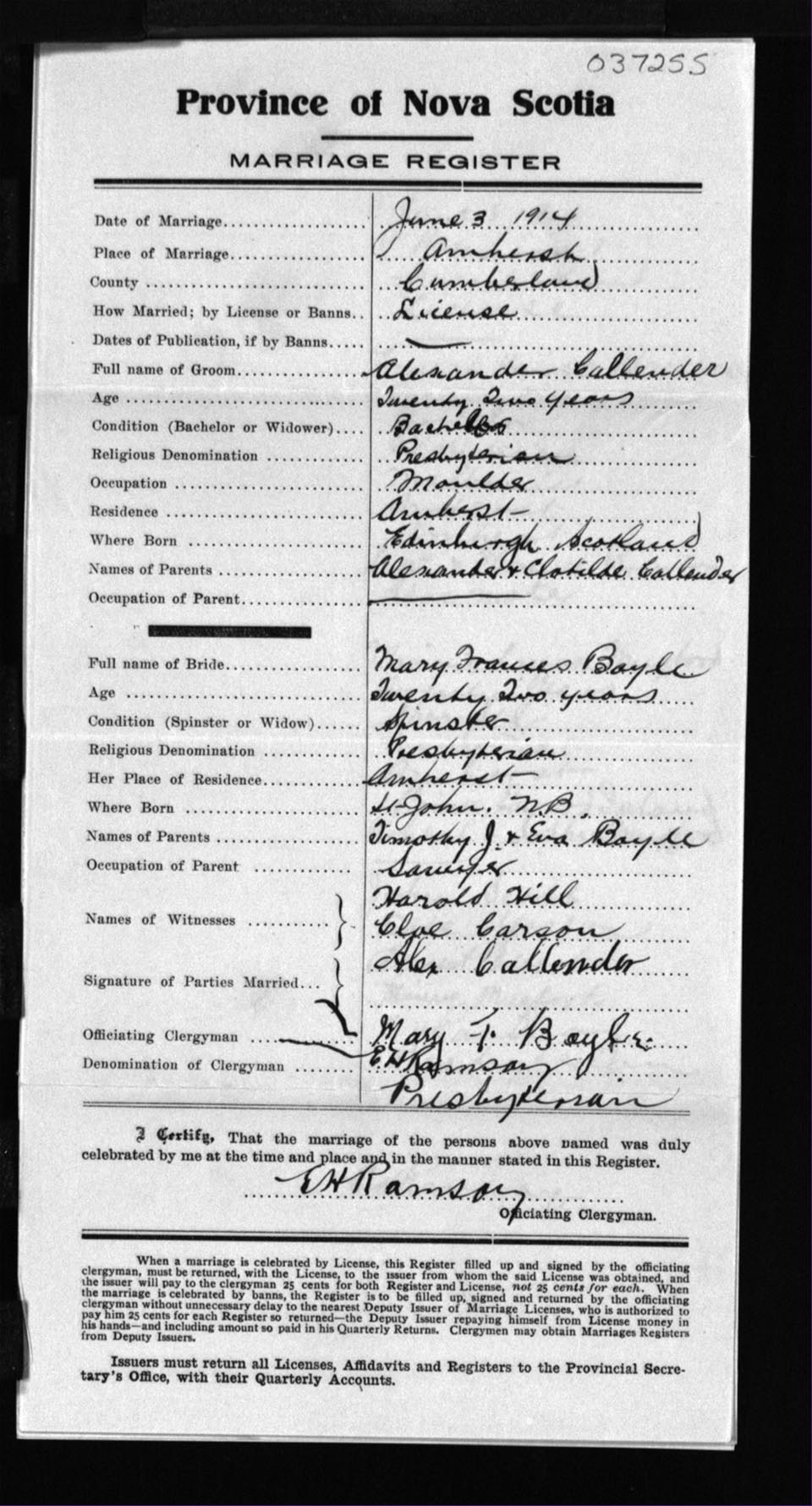 Registration: Year: 1914 number: 37255