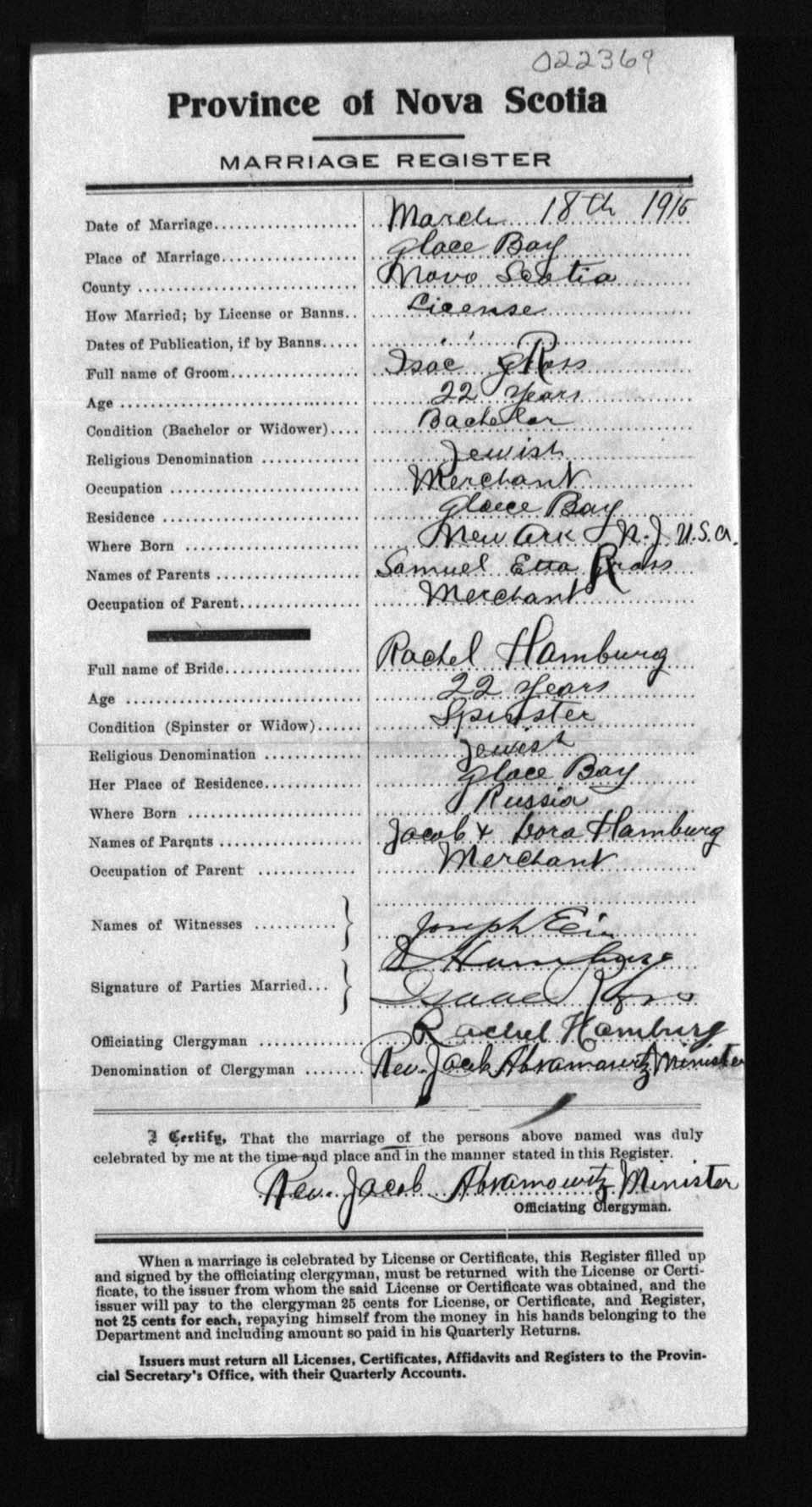 Registration: Year: 1915 number: 22369