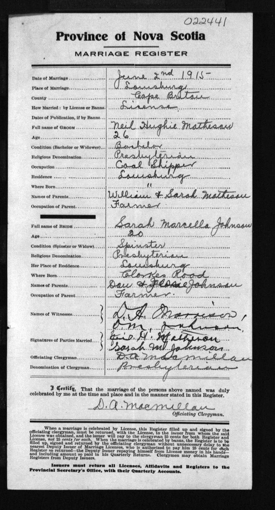 Registration: Year: 1915 number: 22441