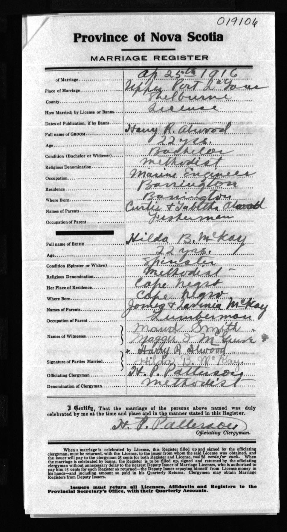 Registration: Year: 1916 number: 19106