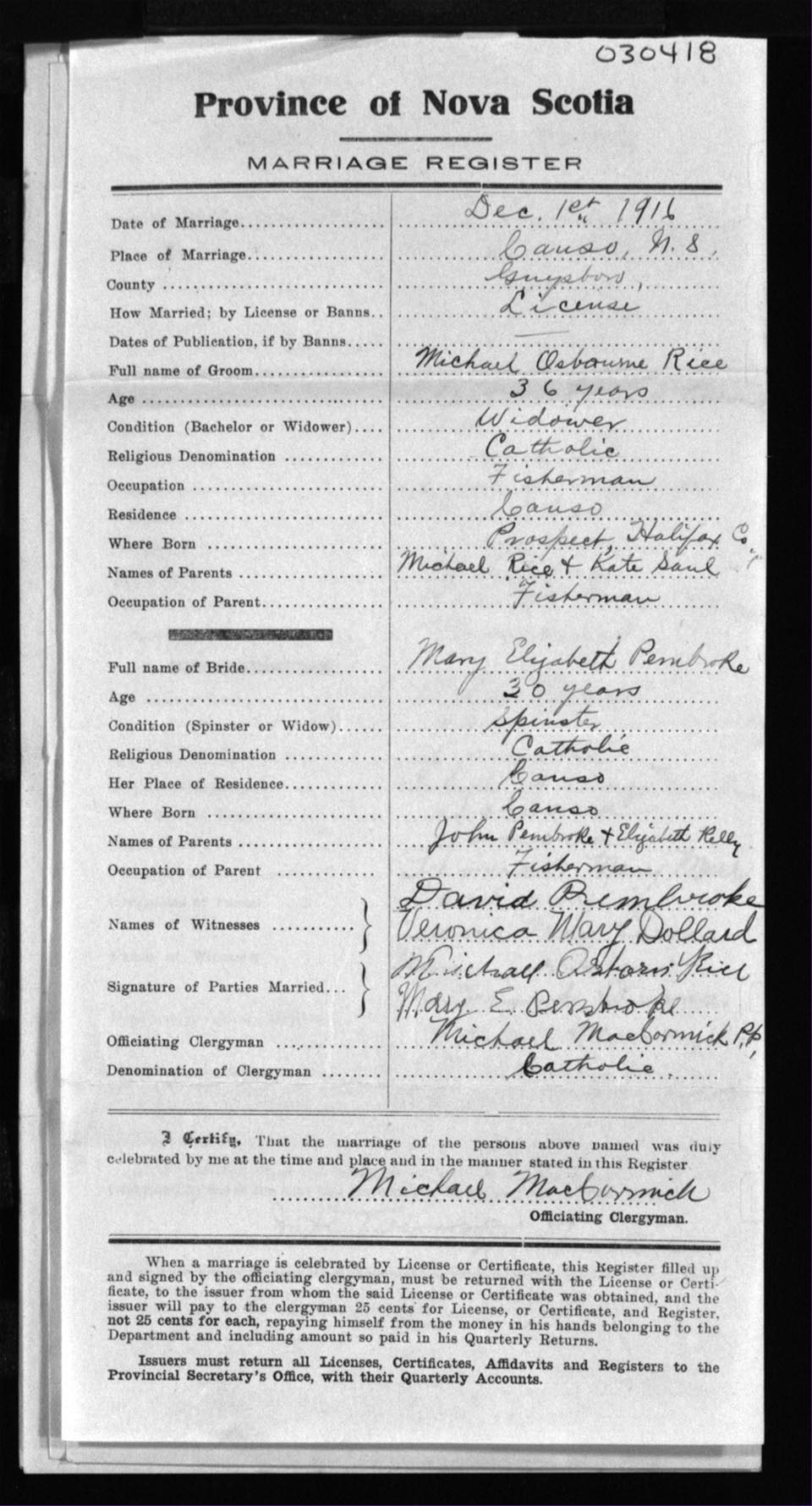 Registration: Year: 1916 number: 30418