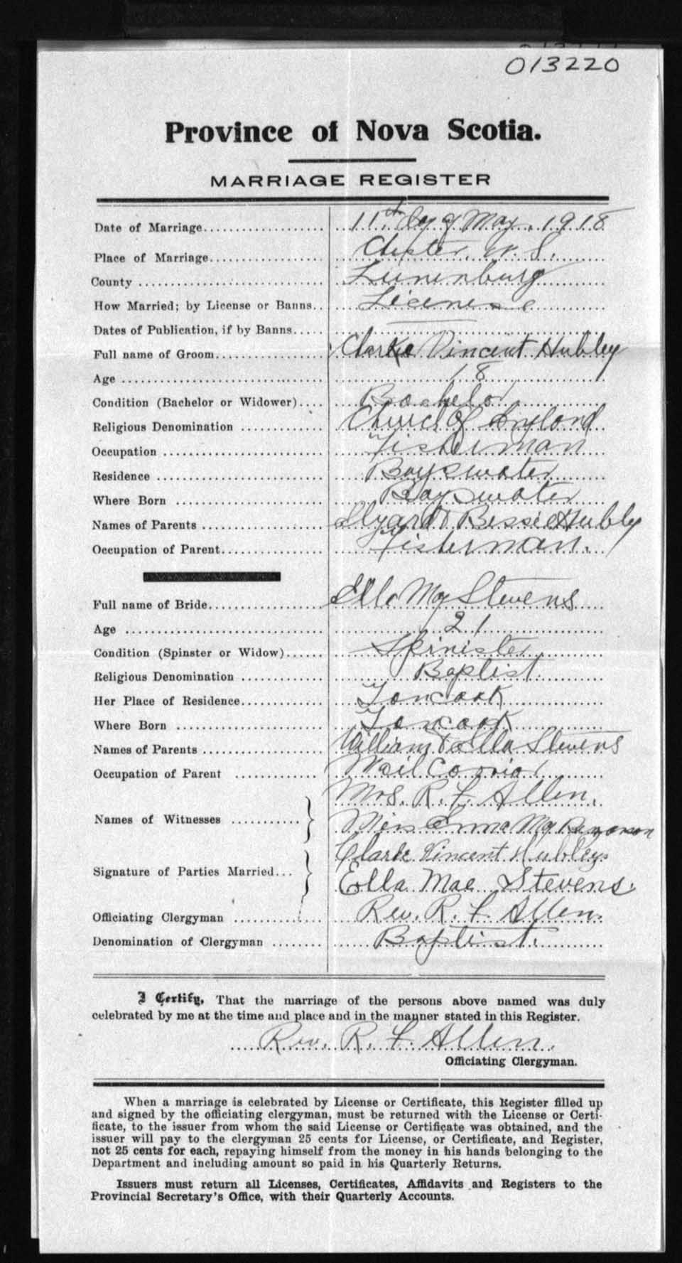 Registration: Year: 1918 number: 13220
