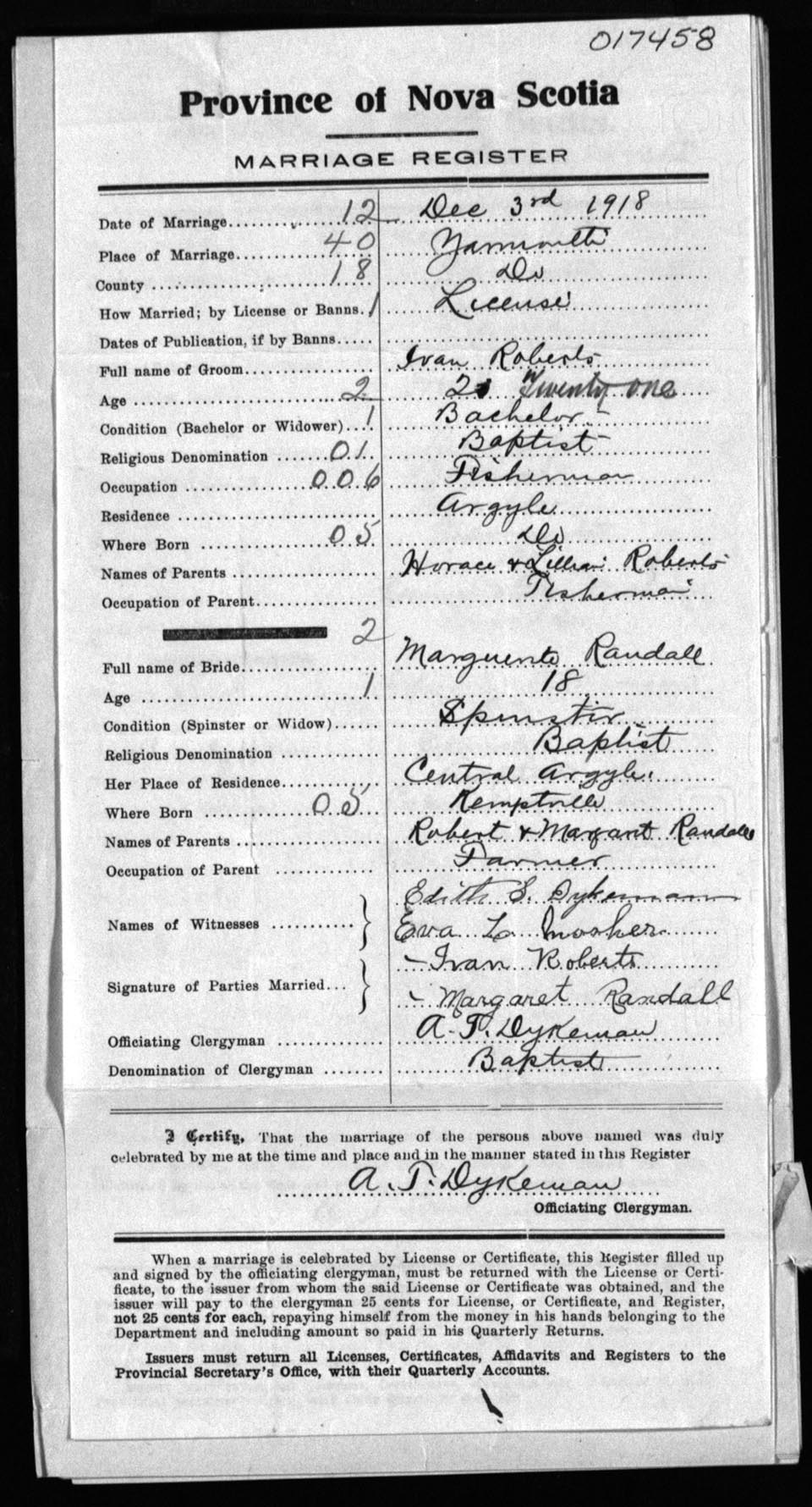 Registration: Year: 1918 number: 17458