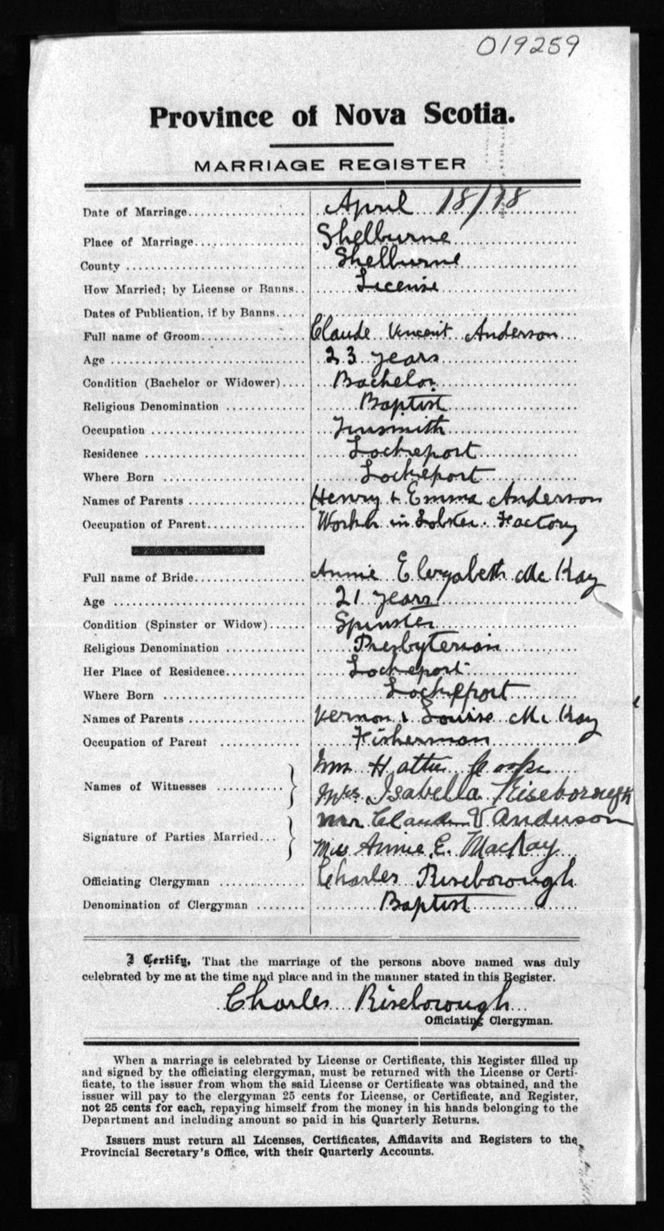 Registration: Year: 1918 number: 19259