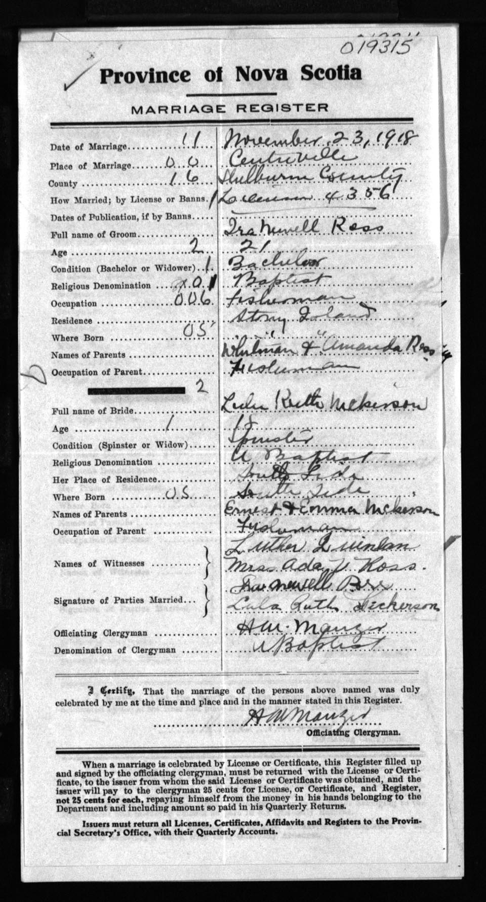 Registration: Year: 1918 number: 19315