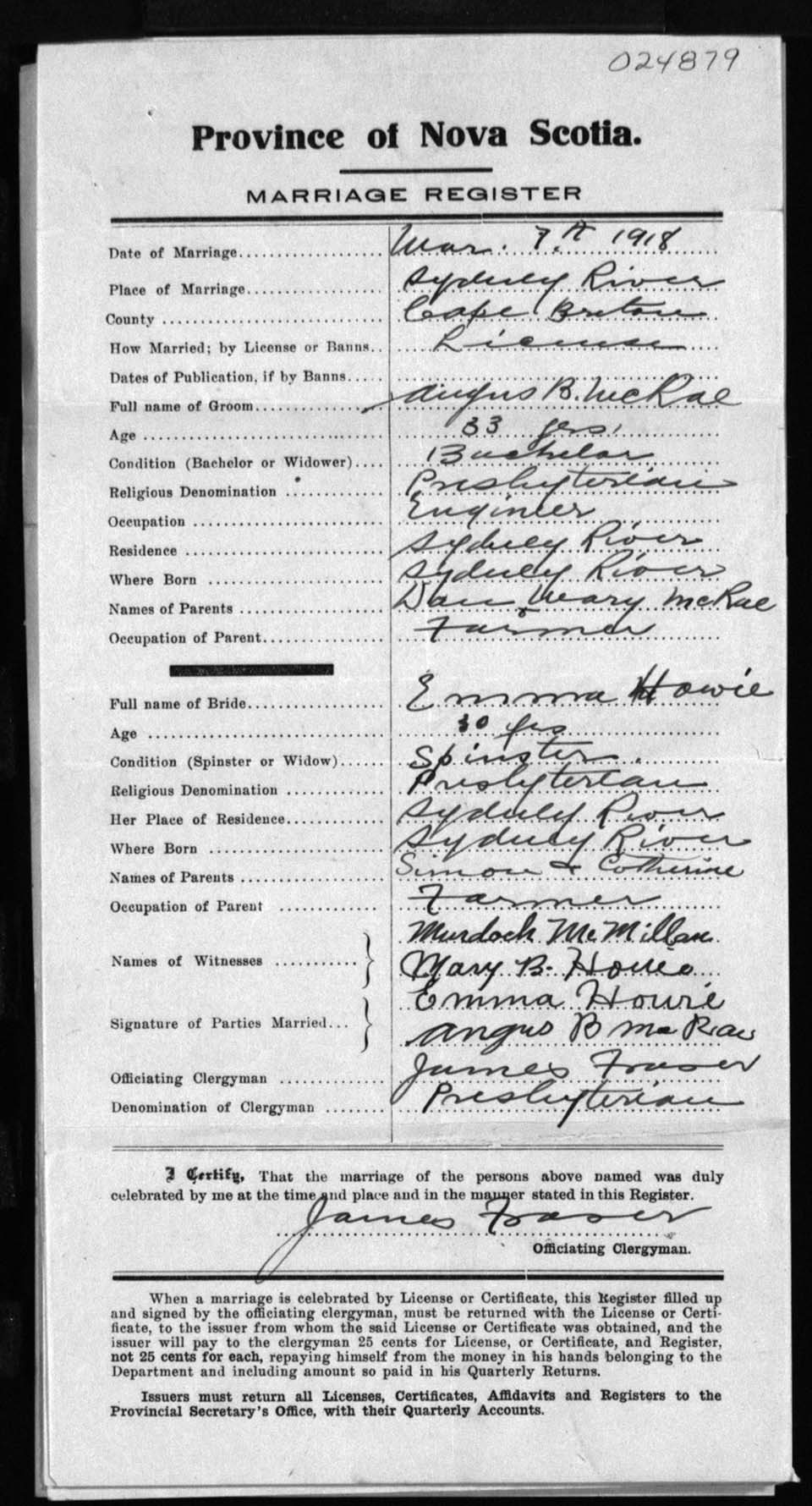 Registration: Year: 1918 number: 24879