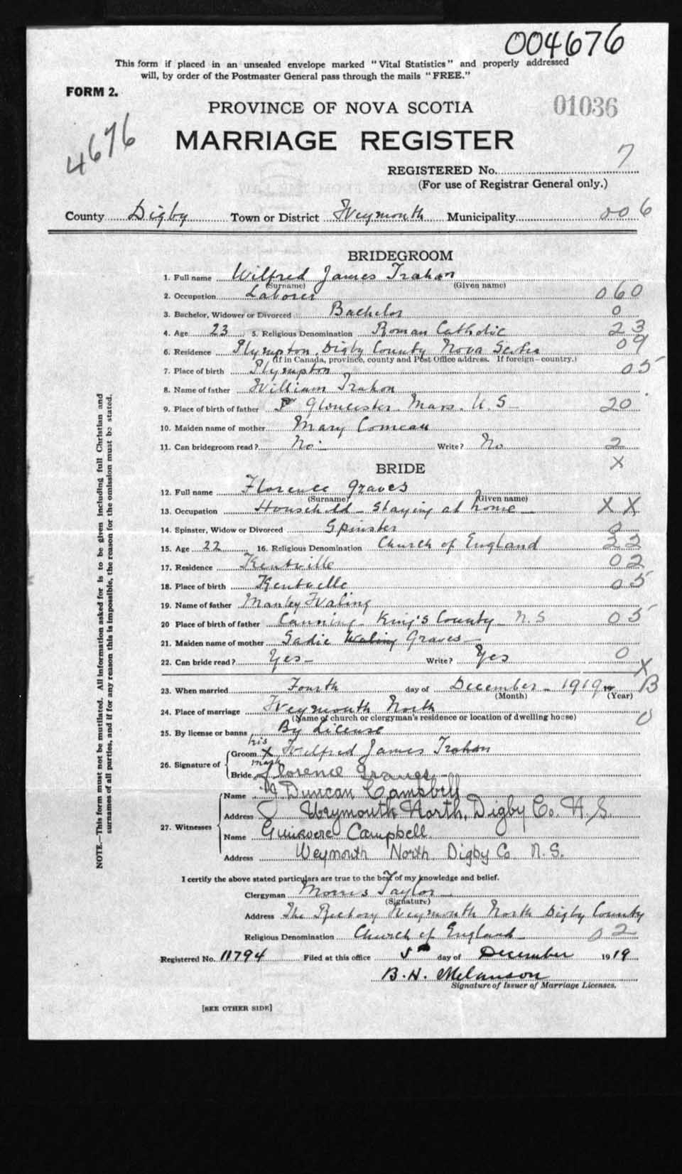 Registration: Year: 1919 number: 4676