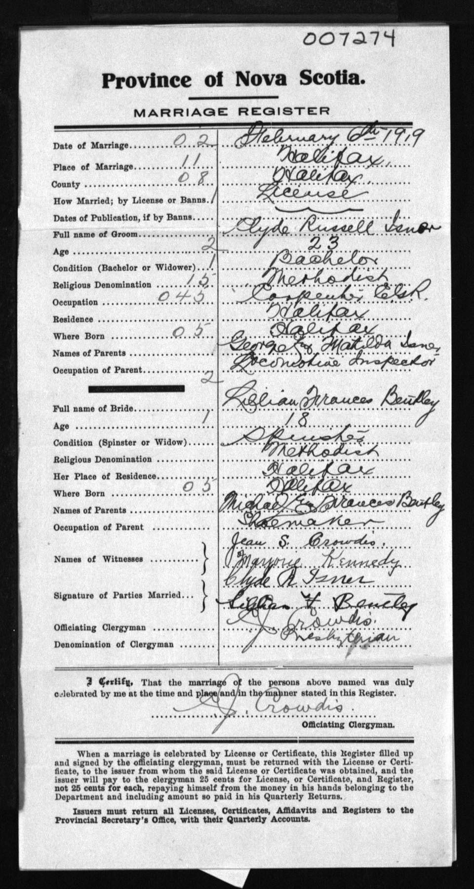 Registration: Year: 1919 number: 7274