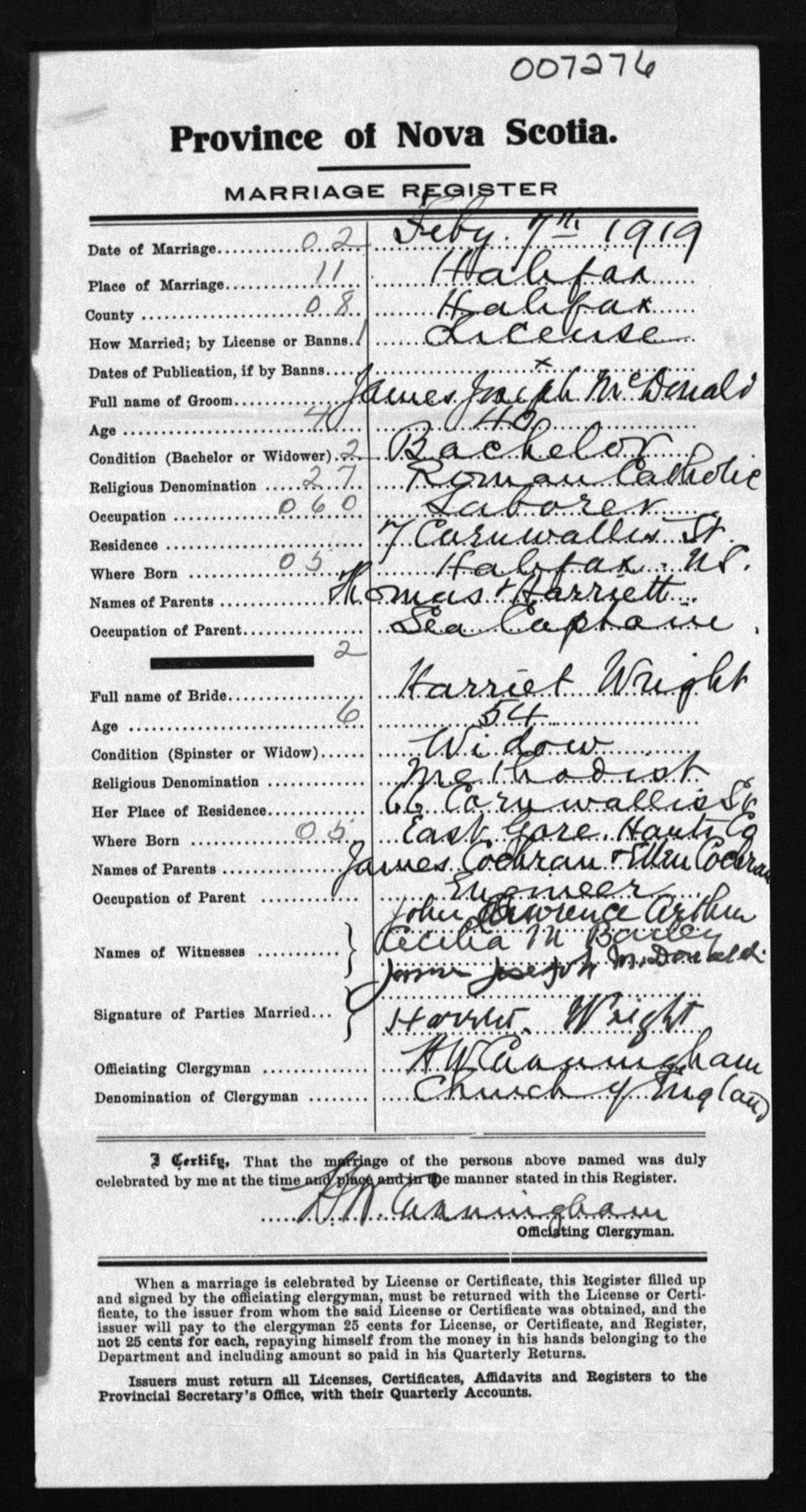 Registration: Year: 1919 number: 7276