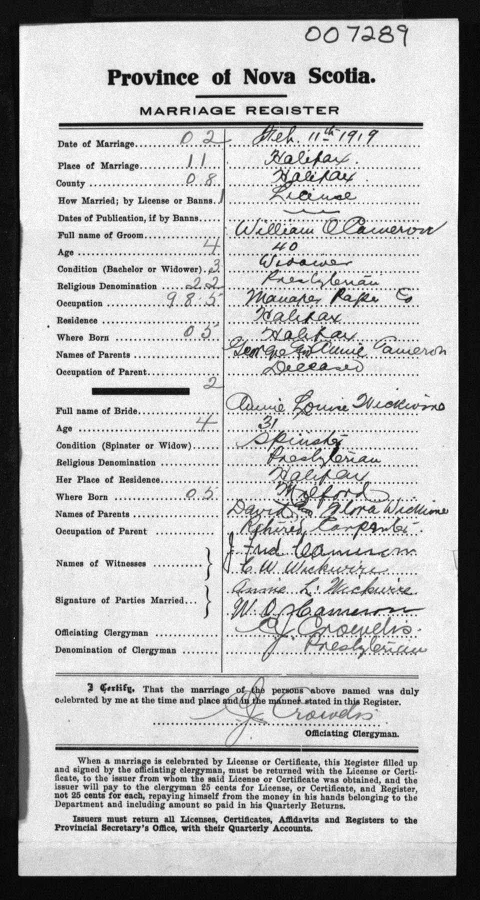 Registration: Year: 1919 number: 7289