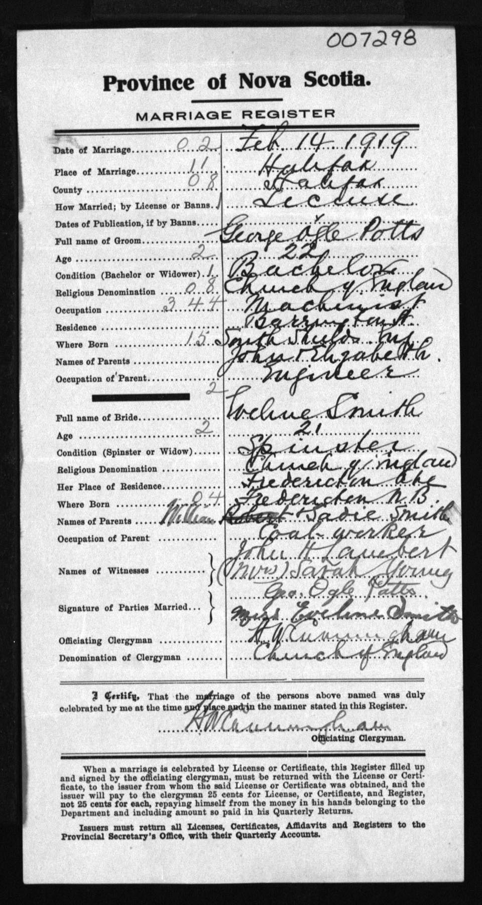 Registration: Year: 1919 number: 7298