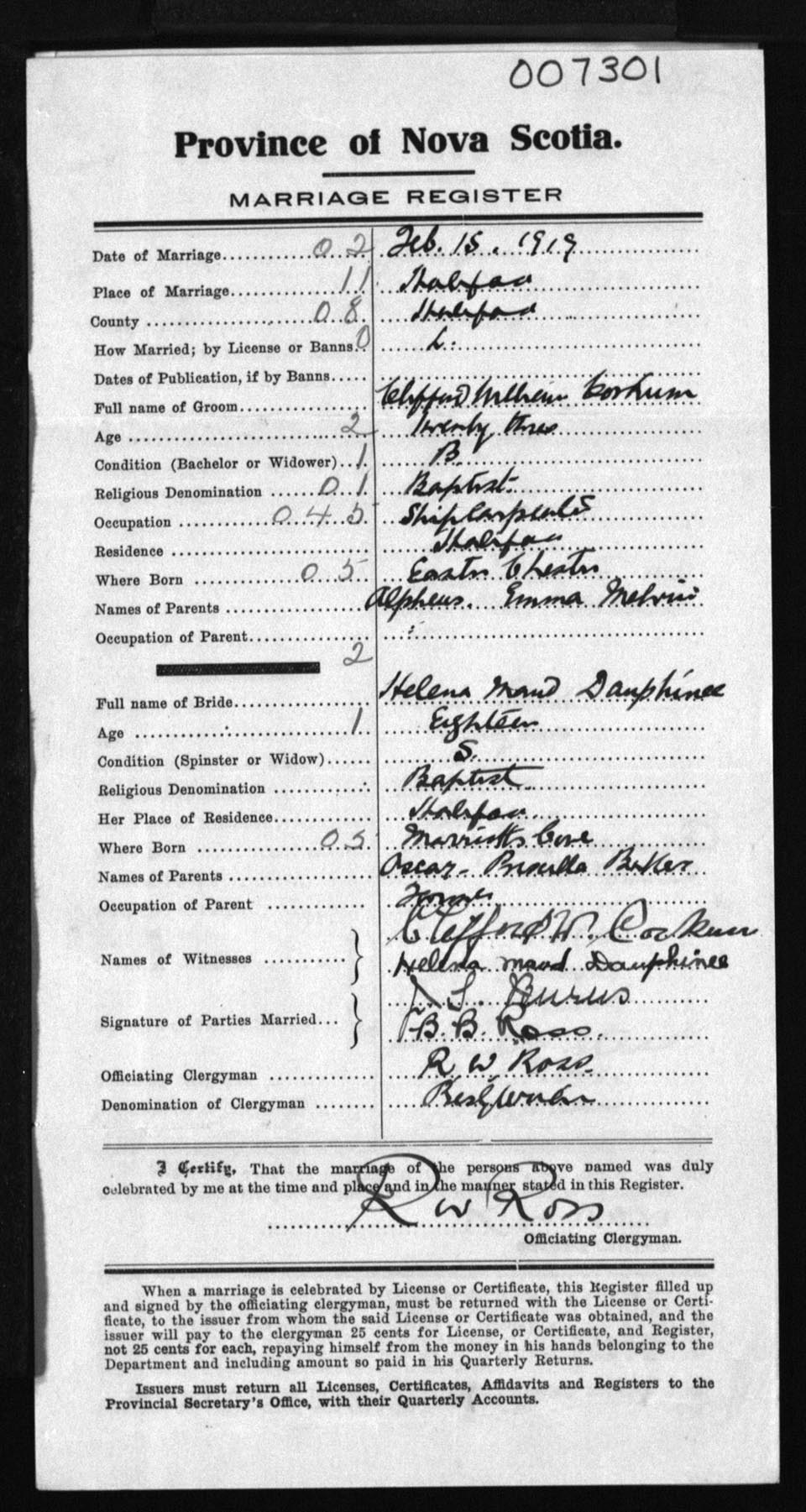 Registration: Year: 1919 number: 7301