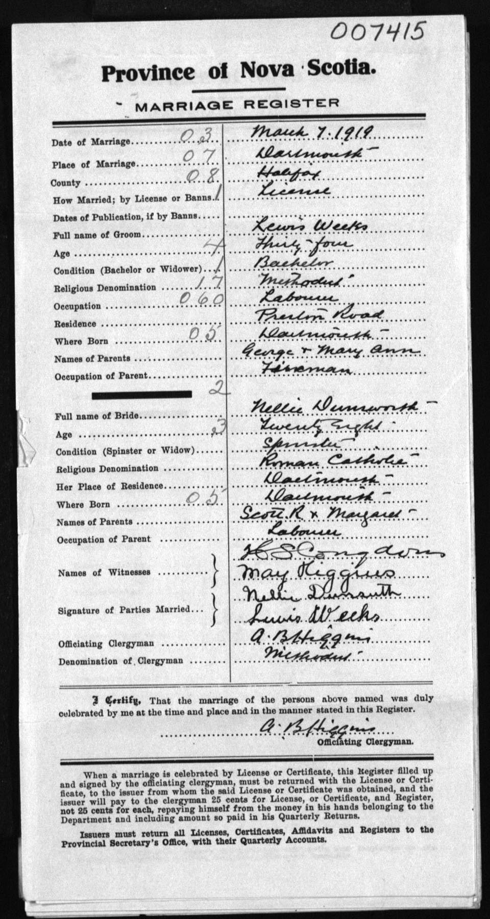 Registration: Year: 1919 number: 7415