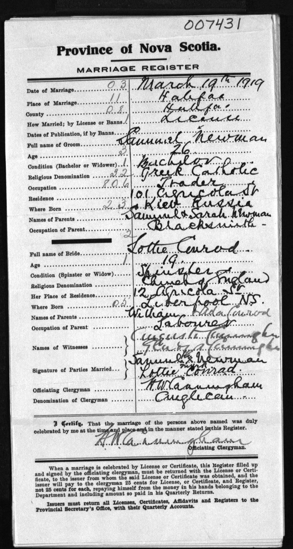 Registration: Year: 1919 number: 7431