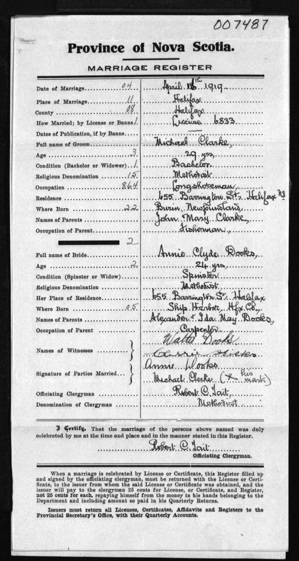 Registration: Year: 1919 number: 7487