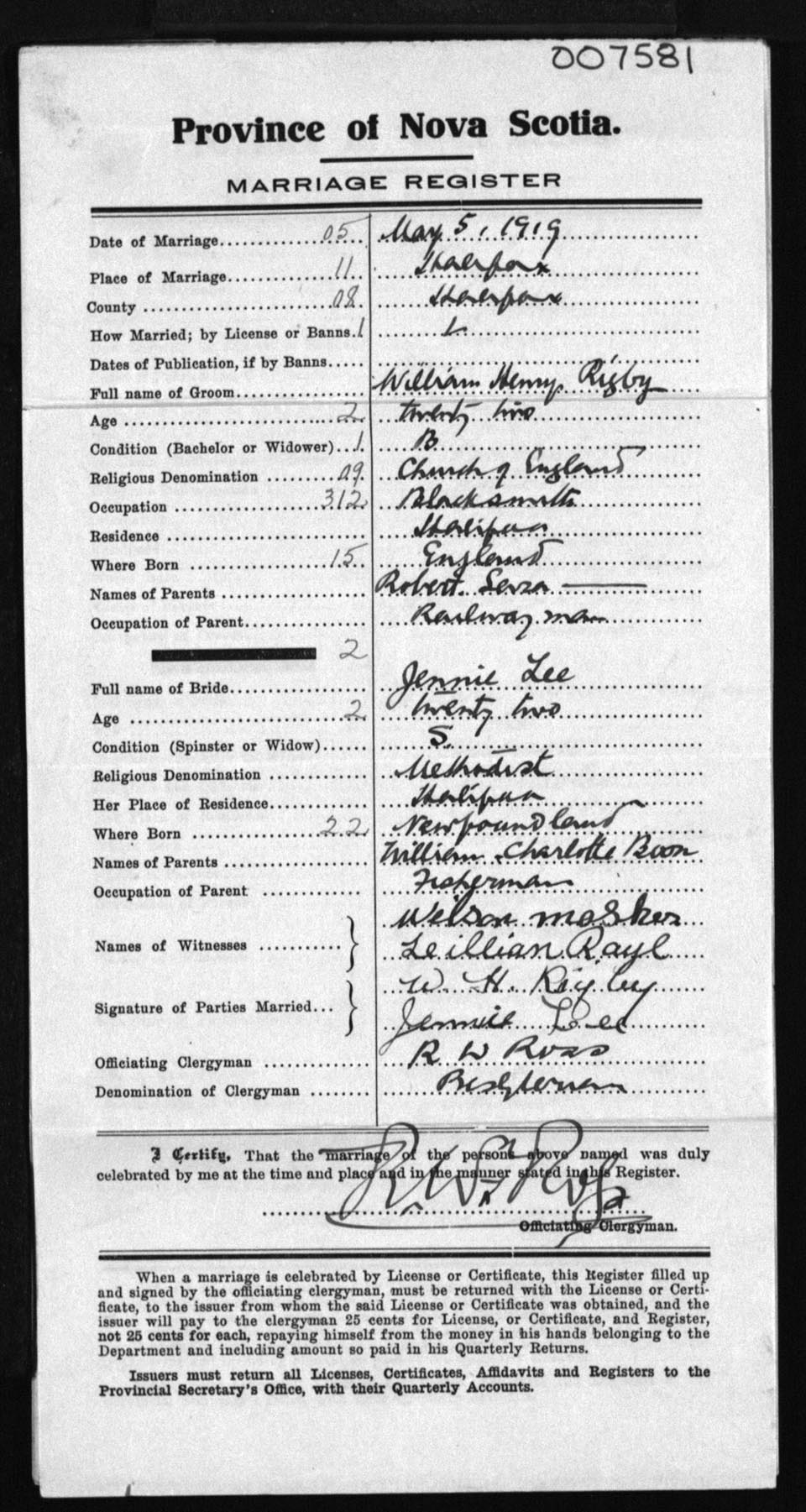 Registration: Year: 1919 number: 7581