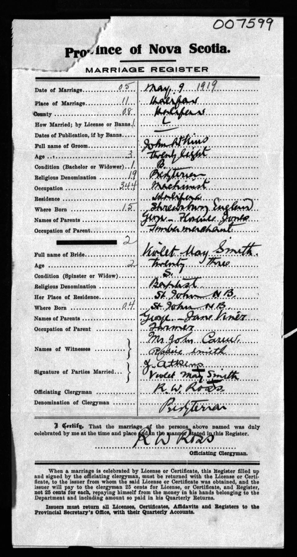 Registration: Year: 1919 number: 7599