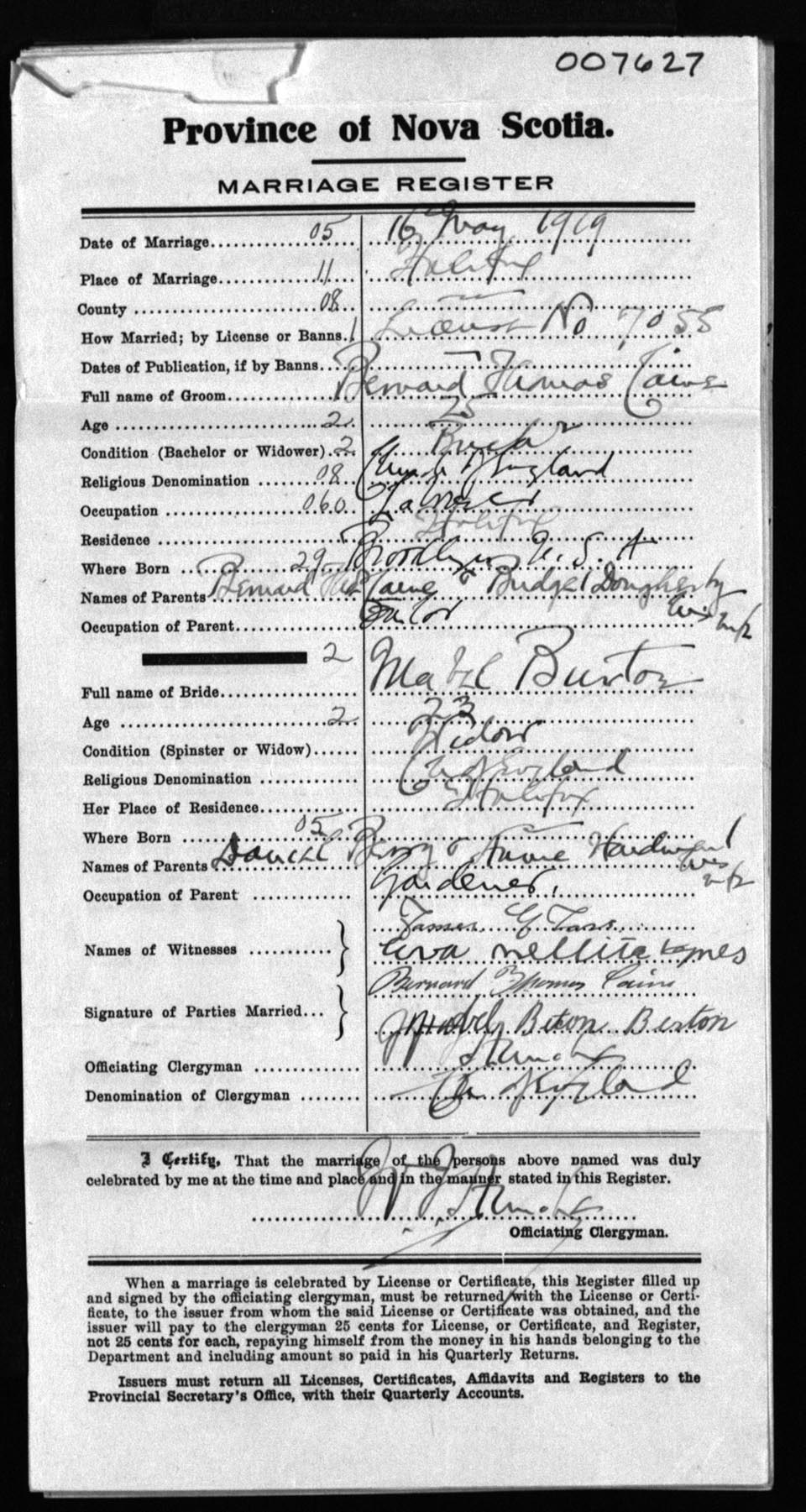 Registration: Year: 1919 number: 7627