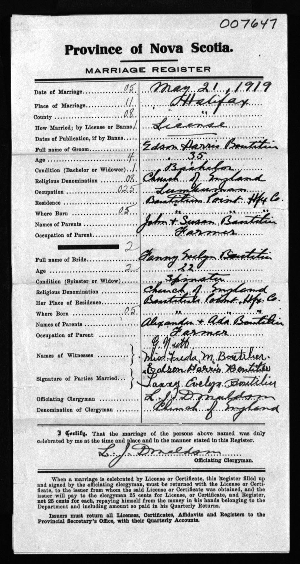 Registration: Year: 1919 number: 7647