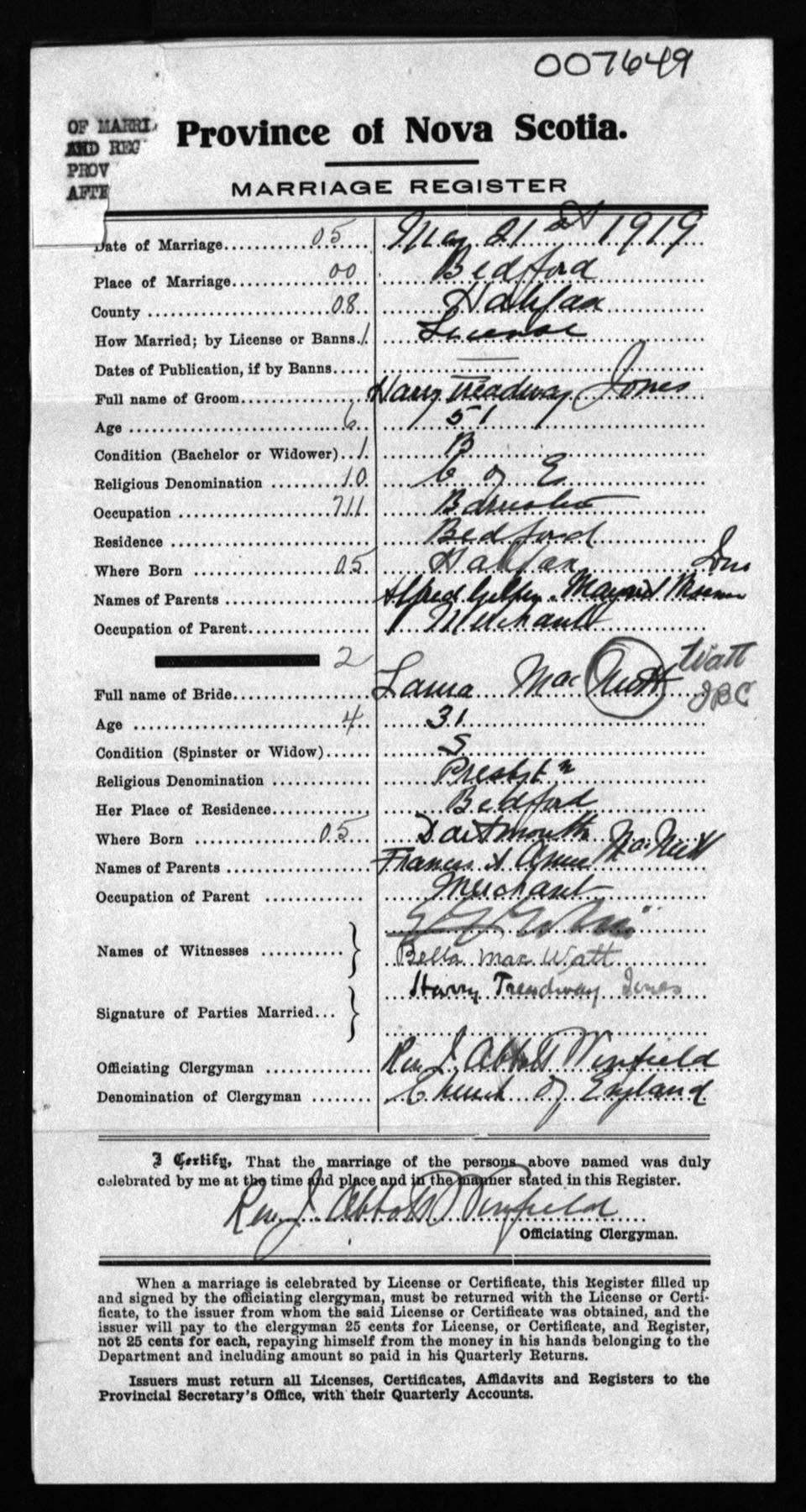 Registration: Year: 1919 number: 7649