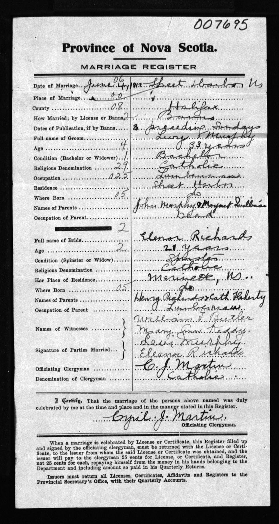 Registration: Year: 1919 number: 7695
