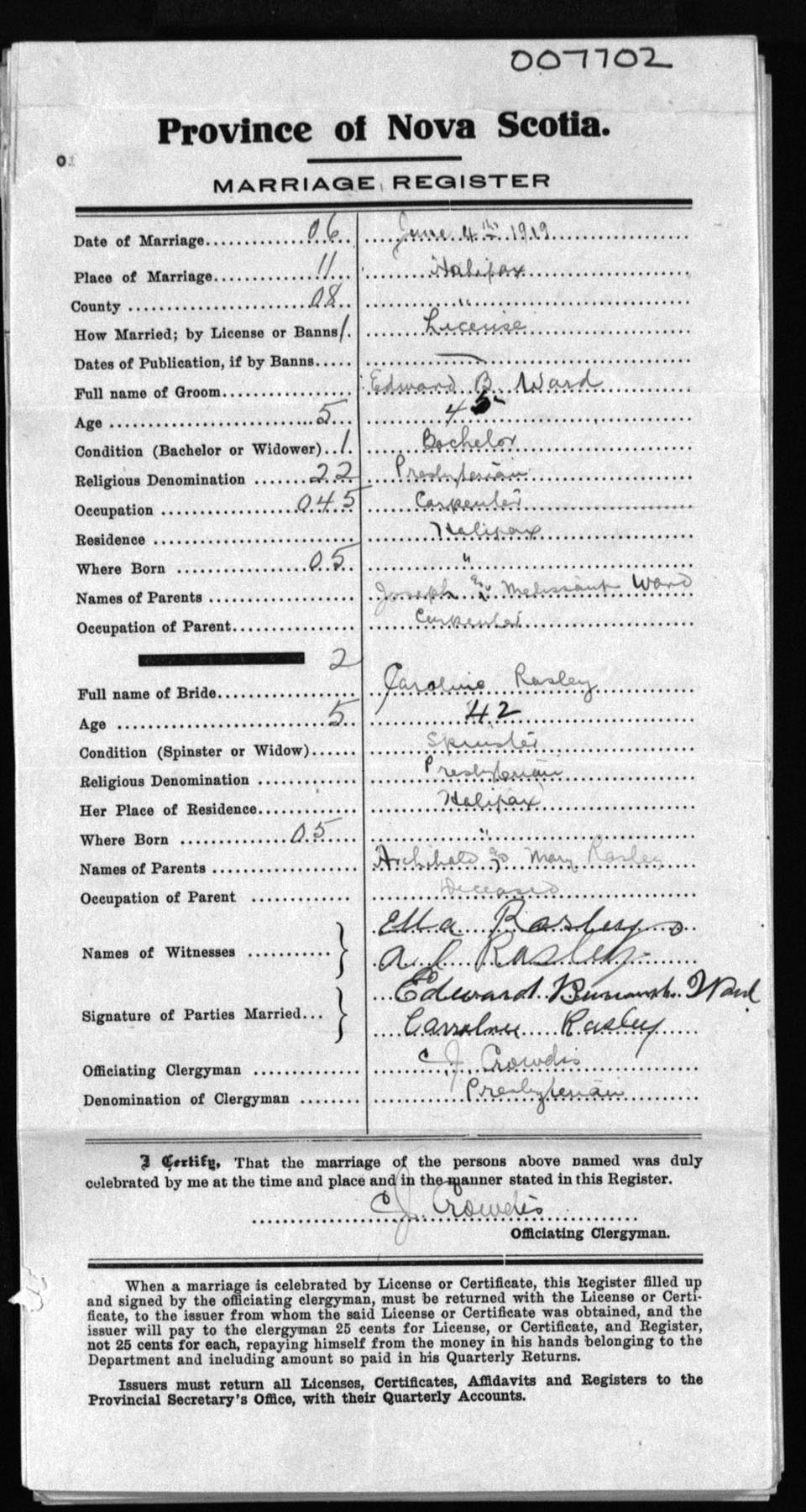 Registration: Year: 1919 number: 7702