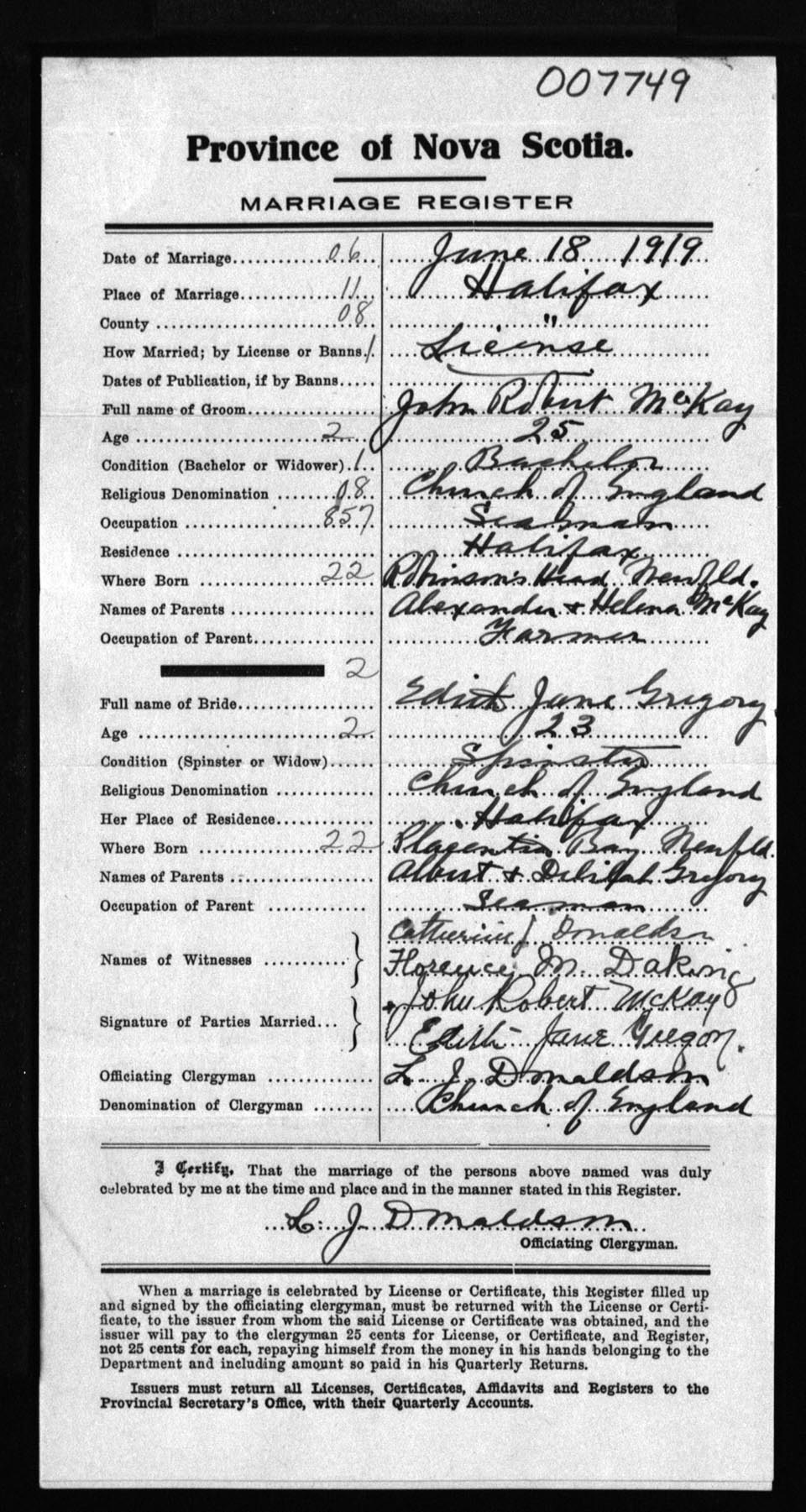 Registration: Year: 1919 number: 7749