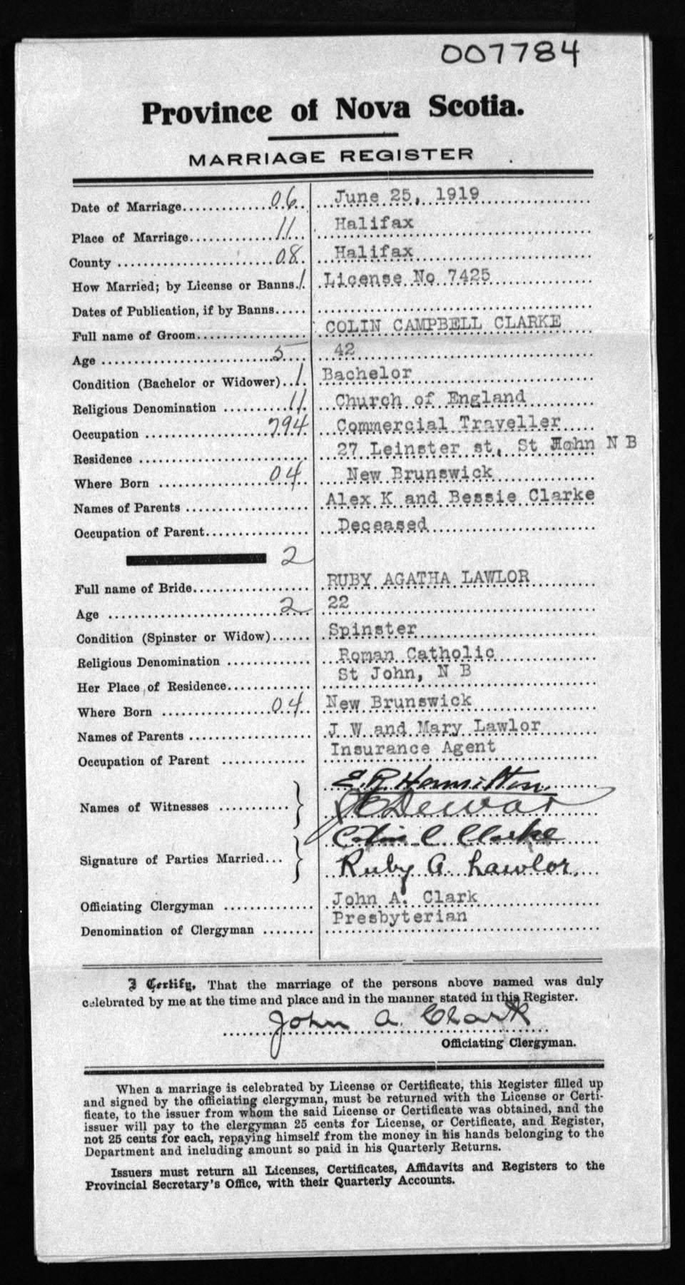 Registration: Year: 1919 number: 7784