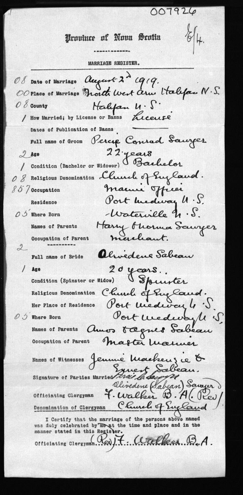 Registration: Year: 1919 number: 7926