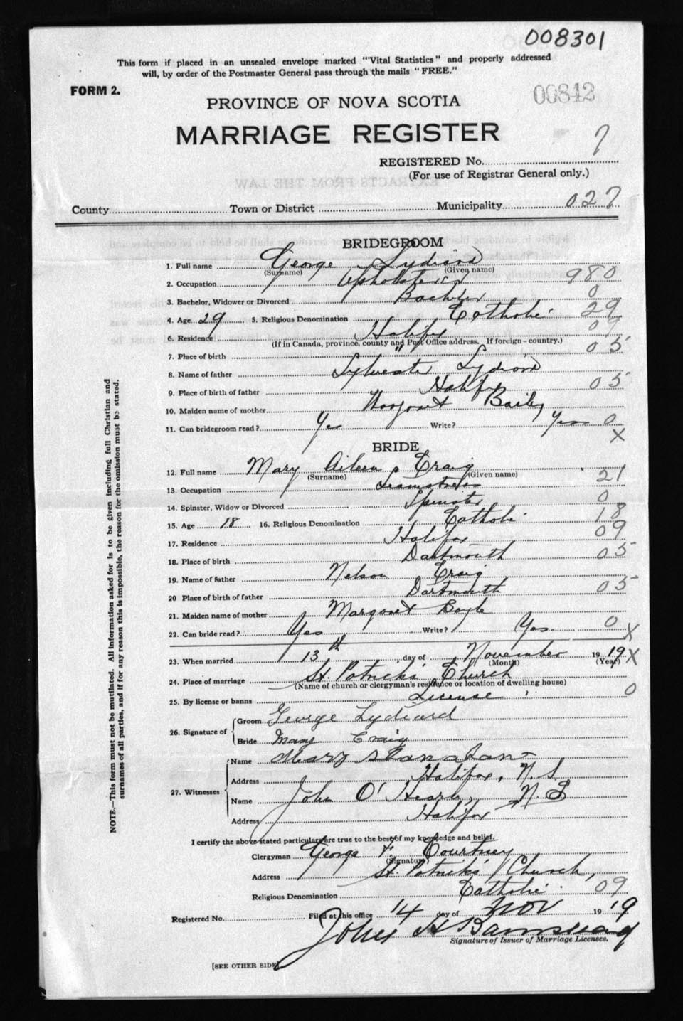 Registration: Year: 1919 number: 8301
