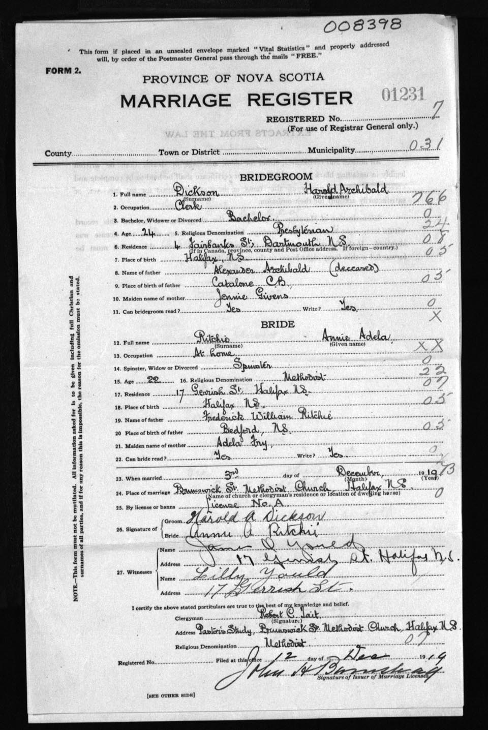 Registration: Year: 1919 number: 8398