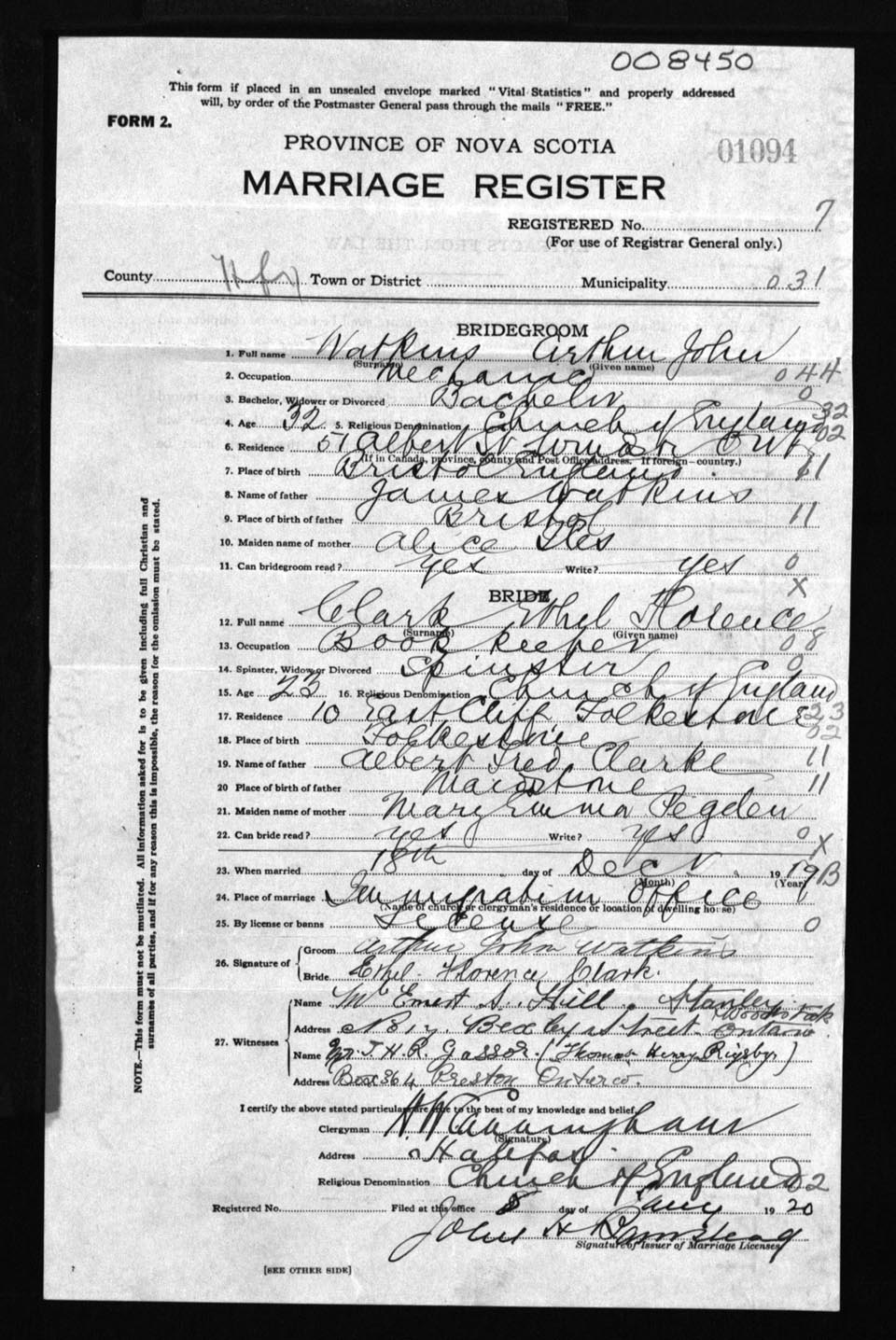 Registration: Year: 1919 number: 8450