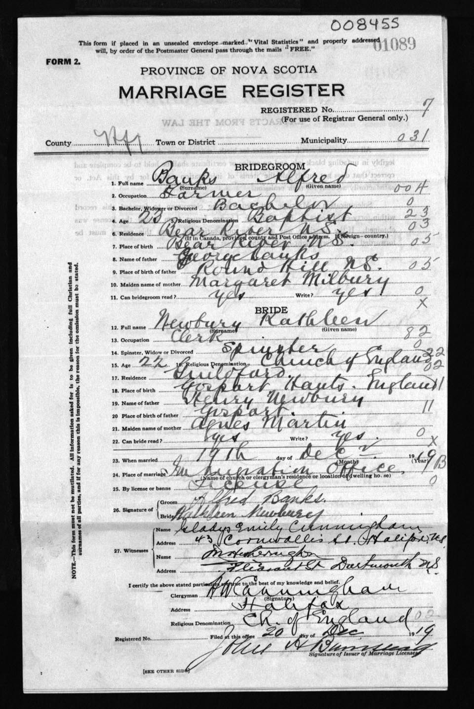 Registration: Year: 1919 number: 8455