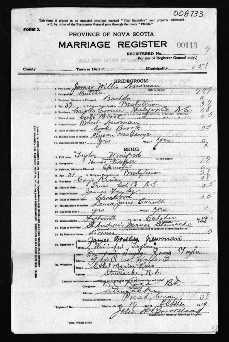 Registration: Year: 1919 number: 8733