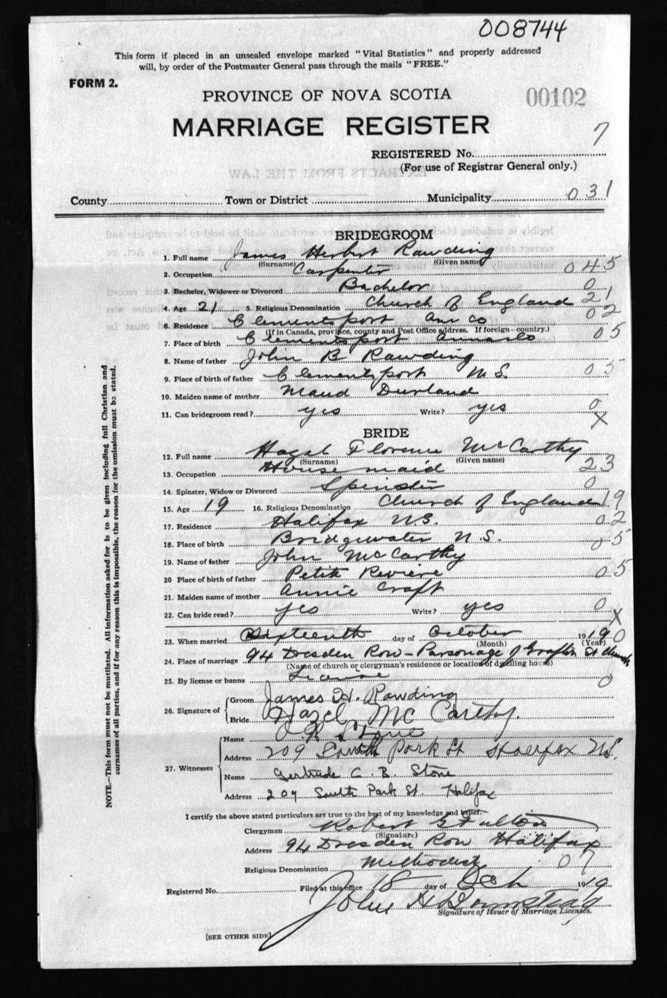 Registration: Year: 1919 number: 8744