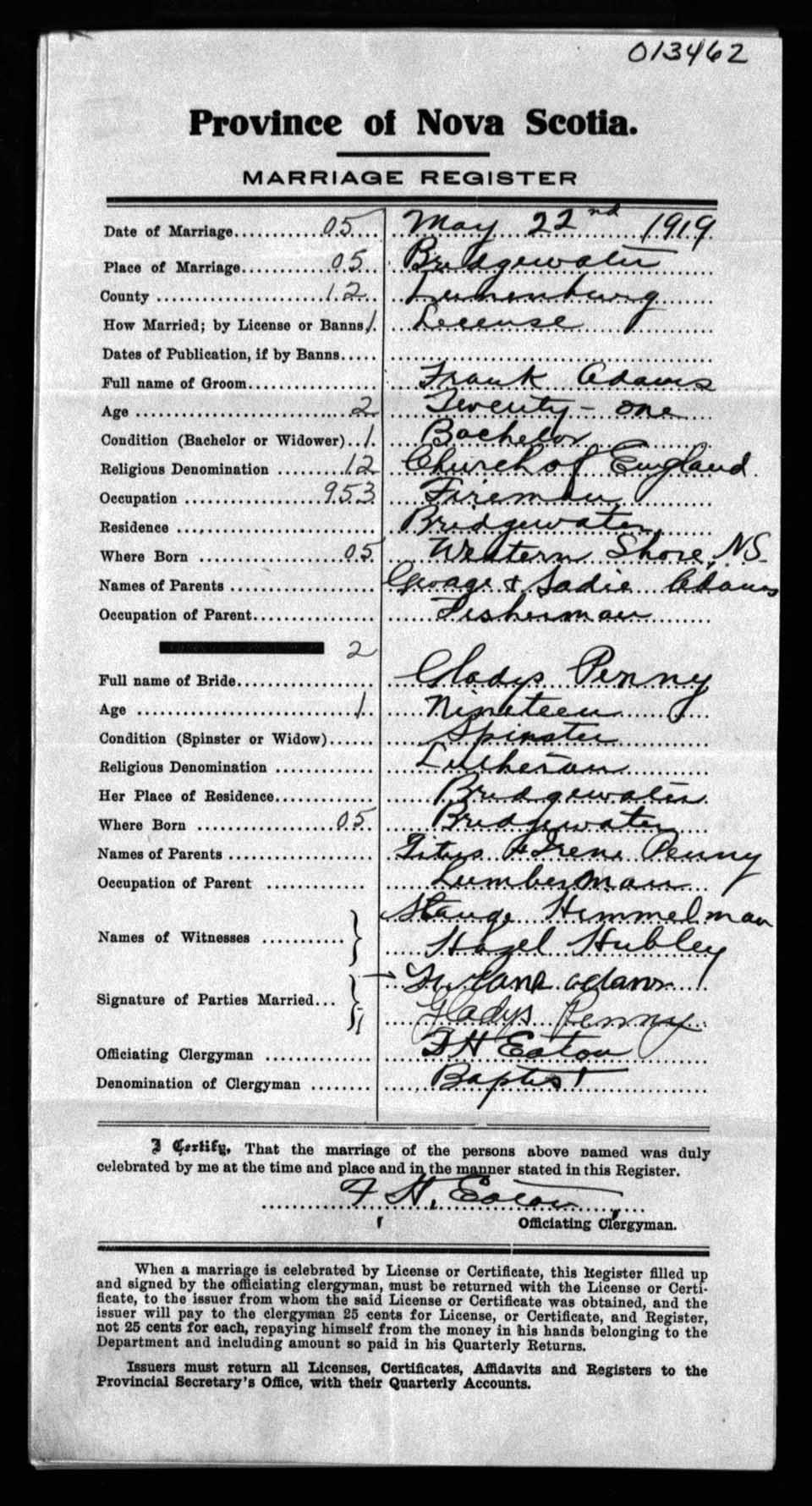 Registration: Year: 1919 number: 13462