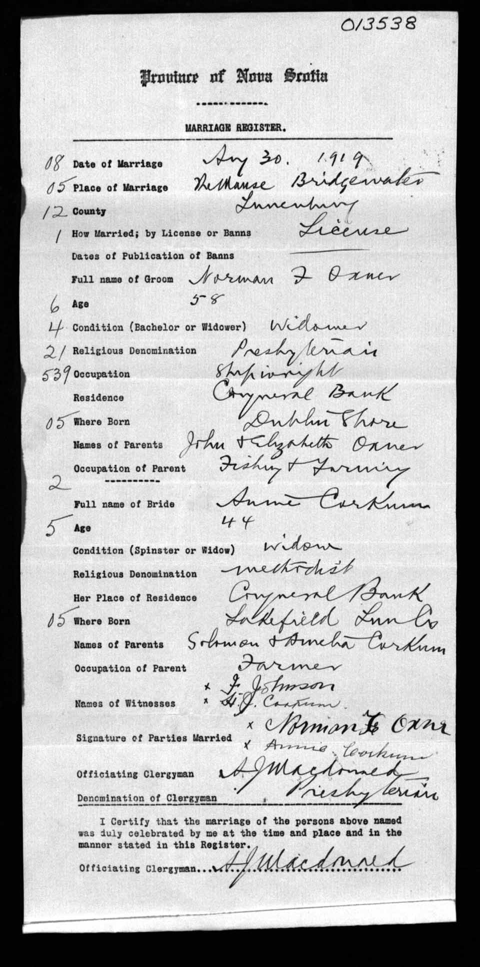 Registration: Year: 1919 number: 13538